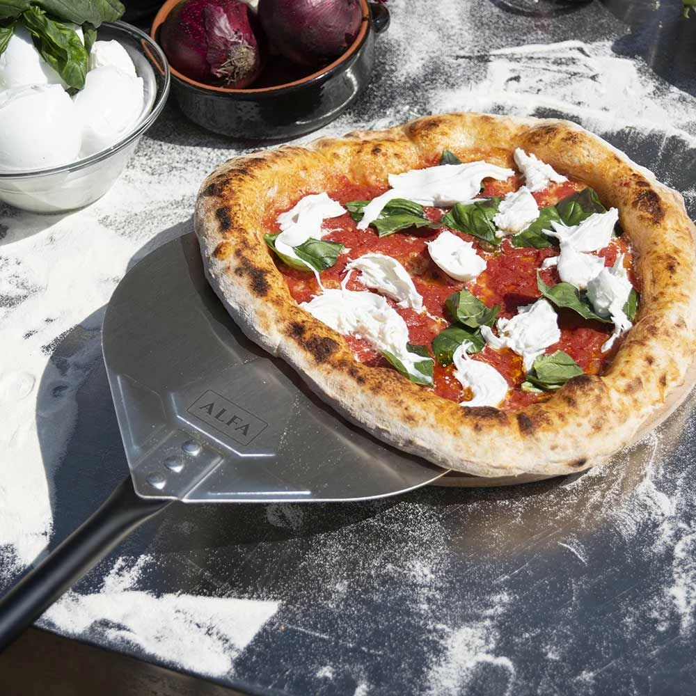 Alfa AC-LGPEEL36 36-Inch Large Pizza Peel provides a premium accessory for use with your Alfa oven. This pizza peel features aluminum and stainless steel construction for superior durability, while an adjustable length tubular handle makes it easier to work near hot ovens. A professional non-slip handle provides excellent grip, while the functional design of this tool makes baking more convenient every time you use your oven. This item is available in either a red or black finish.