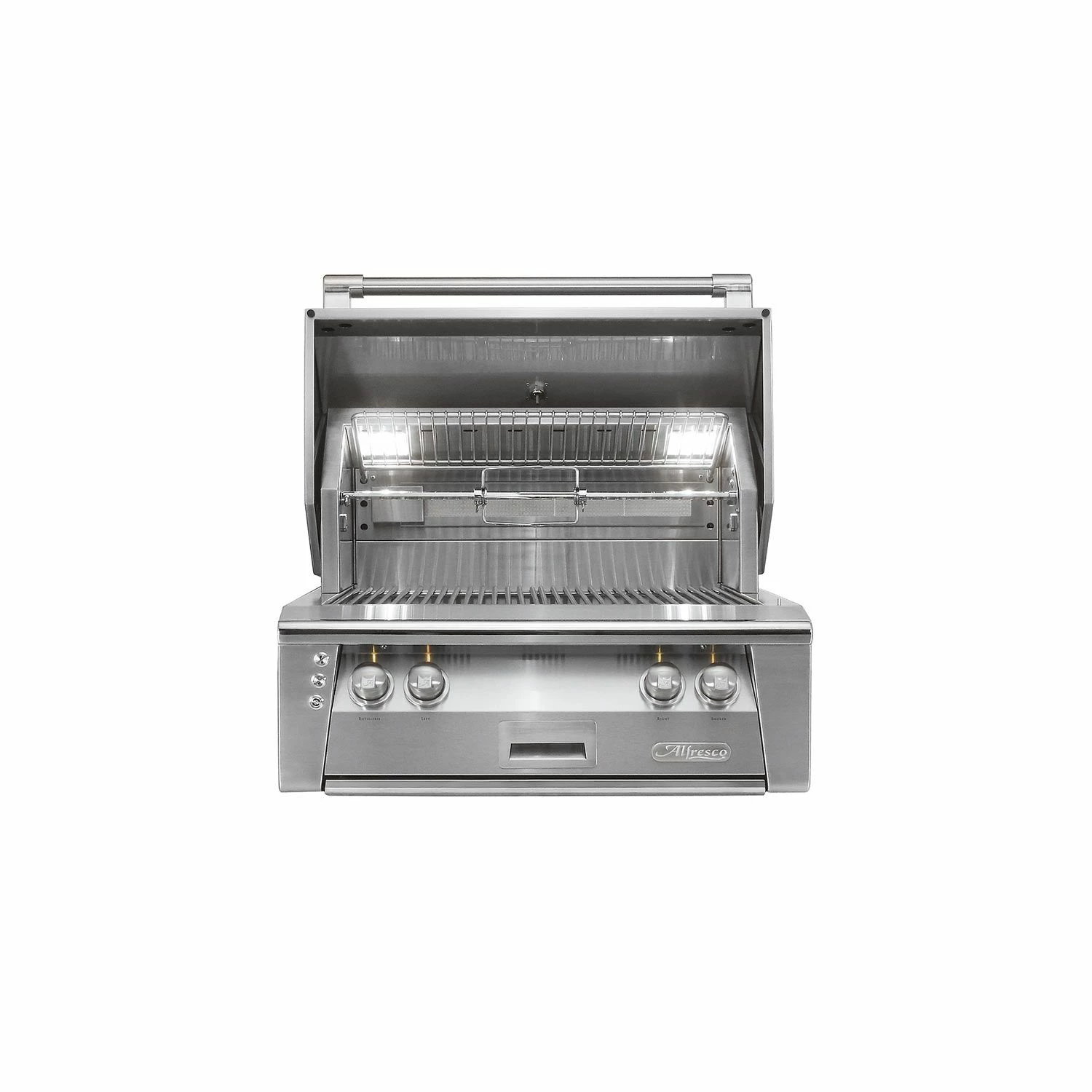 Alfresco ALXE-30 Built-In Grill, 30-Inch provides a high performance luxury grill that is a terrific option to complete your outdoor kitchen. The 304 stainless steel grill features (2) 18-SR stainless steel main burners producing 55,000 BTUs with 542 square inches of grilling area with the option to upgrade to a Sear Zone infrared burner. The Sear Zone features a “V-shaped” design and reaches temperatures up to 1500°F to produce professional steakhouse results – all while using up to 50% less fuel. Above the burners, the pyramid-shaped ceramic briquettes eliminate hot and cold spots to maximize flavor as they evenly deliver heat to the cooking surface. The premium cooking grates have a special nonstick electro-polished finish, to achieve professional grill marks every time.