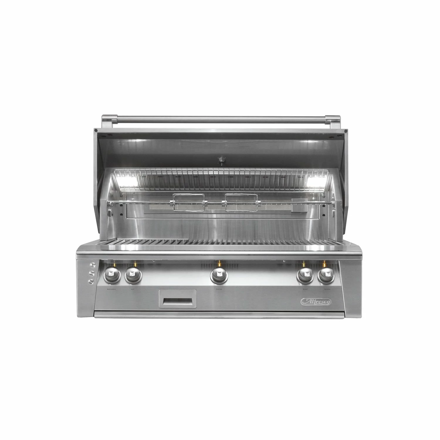 Alfresco ALXE-42 Built-In Grill, 42-Inch provides a high performance luxury grill that is a terrific option to complete your outdoor kitchen. The 304 stainless steel grill features (3) 18-SR stainless steel main burners producing 82,500 BTUs with 770 square inches of grilling area with the option to upgrade to a Sear Zone infrared burner. The Sear Zone features a “V-shaped” design and reaches temperatures up to 1500°F to produce professional steakhouse results – all while using up to 50% less fuel. Above the burners, the pyramid-shaped ceramic briquettes eliminate hot and cold spots to maximize flavor as they evenly deliver heat to the cooking surface. The premium cooking grates have a special nonstick electro-polished finish, to achieve professional grill marks every time.