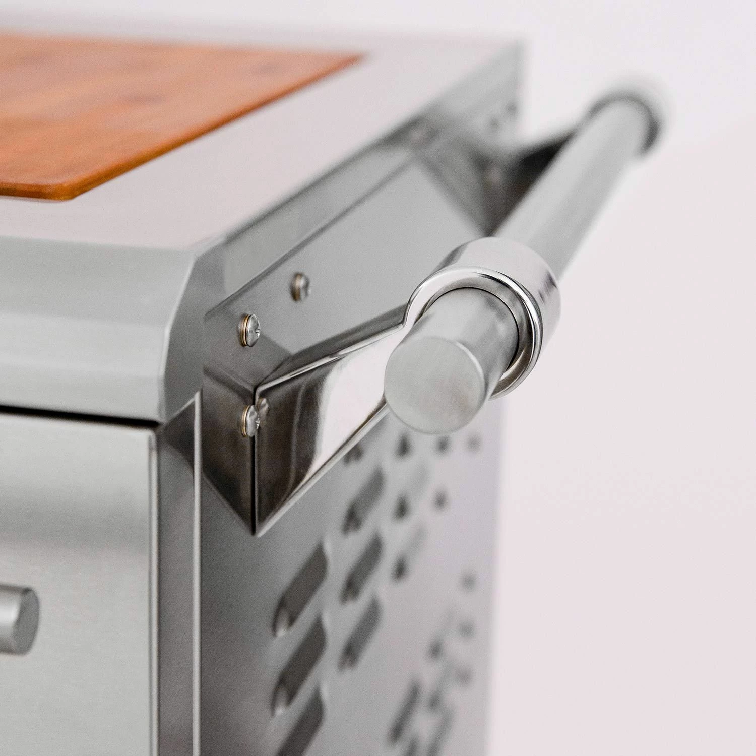American Made Grills AMG-ENC54-CART Encore 54-Inch Dual Fuel Wood and Gas Grill with Infrared Searing Burner and Rotisserie Kit on Cart features American-made quality and performance construction to offer a superior grilling experience. Built from solid 304 stainless steel, it is sure to provide excellent quality for years to come, and it features (8) main burners built from that same 304 stainless steel each putting out 22,000 BTUs each to provide ultra high heat to the signature captured briquette tray for even radiant heat across the 560in² cooking surface. The reversible 9-gauge V-shaped grates offer a substantial grilling surface for professional style grill marks. It also features a patented fuel tray system that allows you to use the gas burners to ignite wood or charcoal, adding excellent flexibility and flavor to your grill game. The cart it comes mounted on features five soft-close storage drawers, a folding shelf, cutting board and smooth caster wheels for ease of movement.