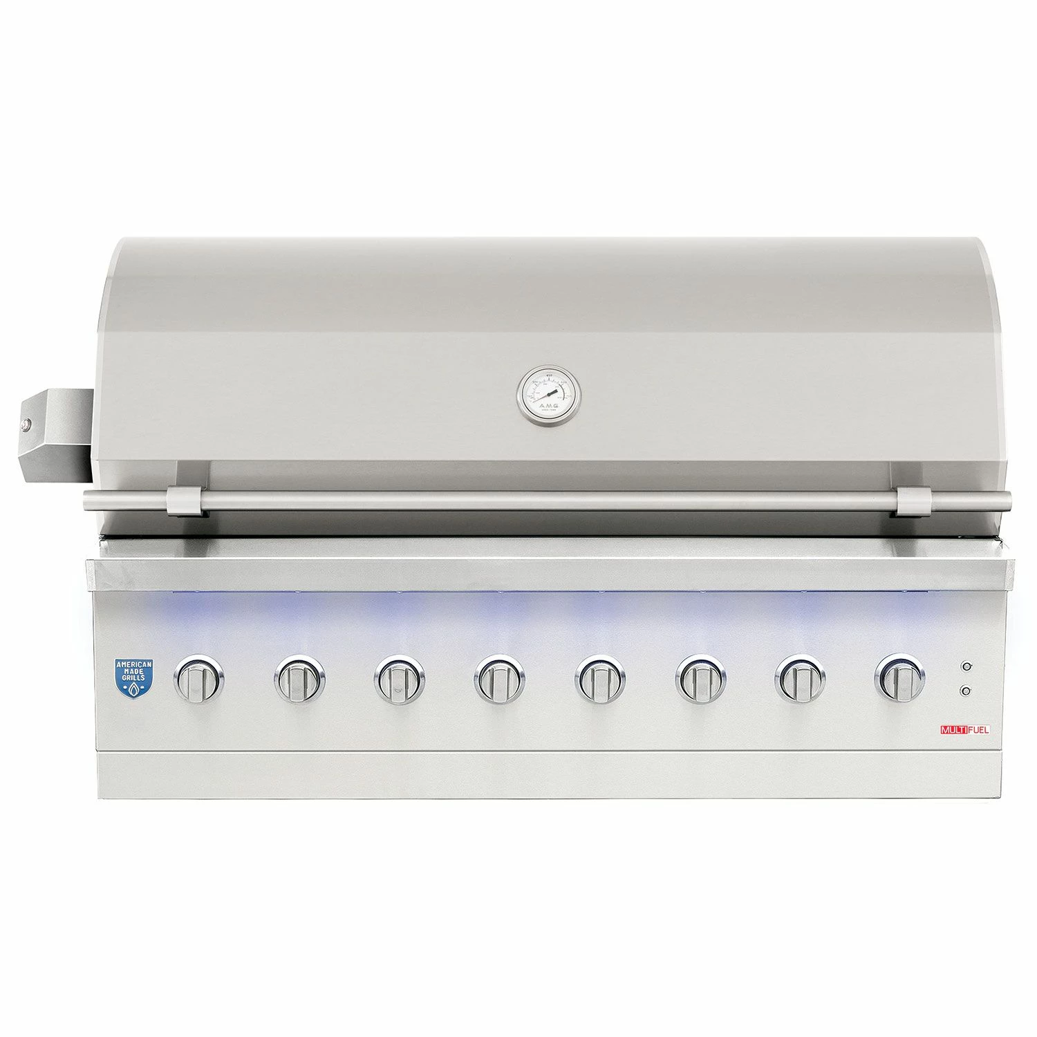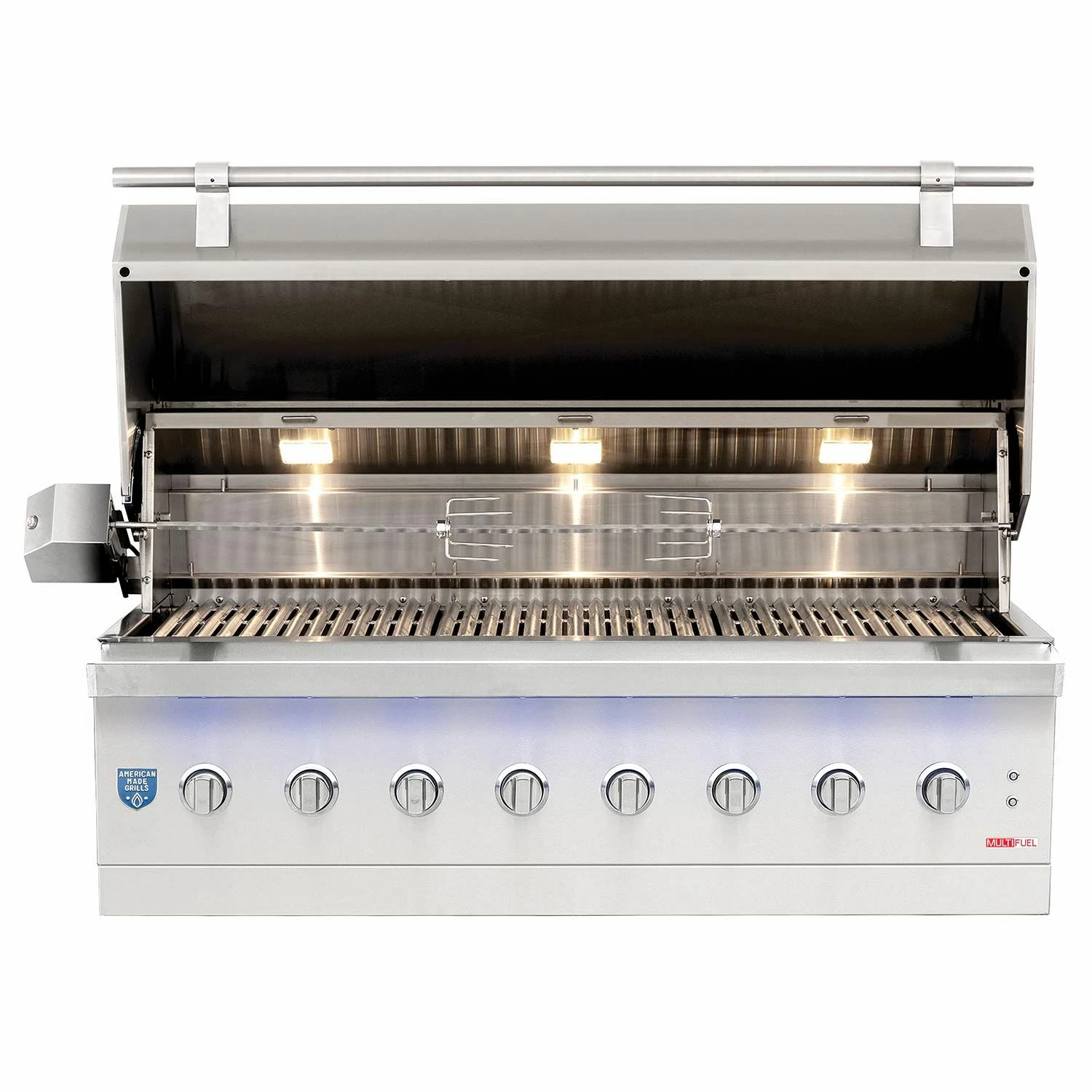 American Made Grills AMG-ENC54 Encore 54-Inch Built-In Dual Fuel Wood and Gas Grill with Infrared Searing Burner and Rotisserie Kit features American-made quality and performance construction to offer a superior grilling experience. Built from solid 304 stainless steel, it is sure to provide excellent quality for years to come, and it features (8) main burners built from that same 304 stainless steel each putting out 22,000 BTUs each to provide ultra high heat to the signature captured briquette tray for even radiant heat across the 560in² cooking surface. The reversible 9-gauge V-shaped grates offer a substantial grilling surface for professional style grill marks. It also features a patented fuel tray system that allows you to use the gas burners to ignite wood or charcoal, adding excellent flexibility and flavor to your grill game.