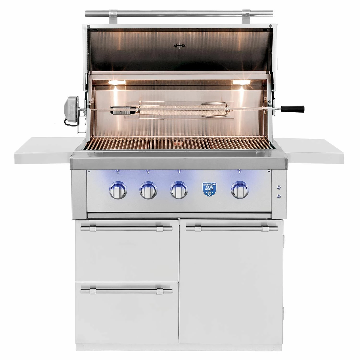 American Made Grills AMG-EST36-CART Estate 36-Inch Gas Grill with Infrared Searing Burner and Rotisserie Kit on Cart features American-made quality and performance construction to offer a superior grilling experience. Built from solid 304 stainless steel, it is sure to provide excellent quality for years to come, and it features (3) red brass main burners that put out 26,000 BTUs each to provide ultra high heat to the signature captured briquette tray for even radiant heat across the 945in² cooking surface. The 9mm thick stainless steel grates offer a thick gauge grilling surface for professional style grill marks. The cart that it comes mounted on features collapsible shelves for additional workspace, dual storage drawers, a magnetic access door and locking caster wheels for ease of movement and safety.