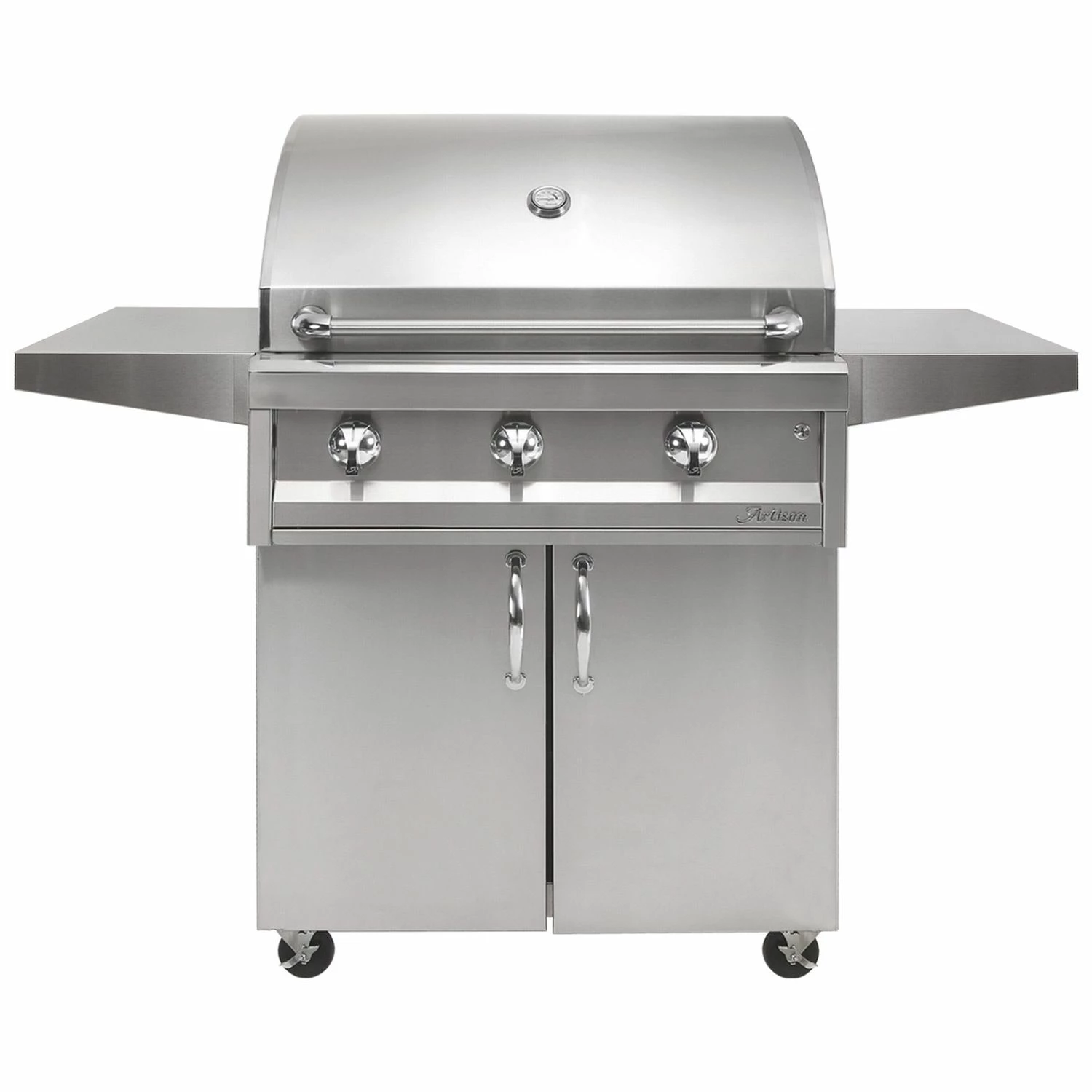 Artisan AAEP-32C American Eagle Series 32-Inch Gas Grill on Cart provides a luxury grill package at an affordable price. Featuring commercial-grade 304 stainless steel construction, Artisan’s Professional Grills are meticulously crafted in the U.S.A. and designed for long-term durability. Heavy-duty 304 stainless steel burners offer high heat, while refractive five-way heat distributing briquettes offer even and radiant heat across the cooking surface. Durable stainless steel cooking grates with a special non-stick electro-polished finish offer restaurant quality cooking and easy cleaning, while an integrated warming and grilling rack provides more versatile cooking options. Ergonomic grill knobs and brass valves offer precision flame control, while stainless steel ignition and lighting buttons are integrated into the control panel for easy operation. This grill also features an exclusive air-cooling plenum which blasts a curtain of cool air between the front control panel and the firebox to keep the front panel and bullnose cool to the touch.