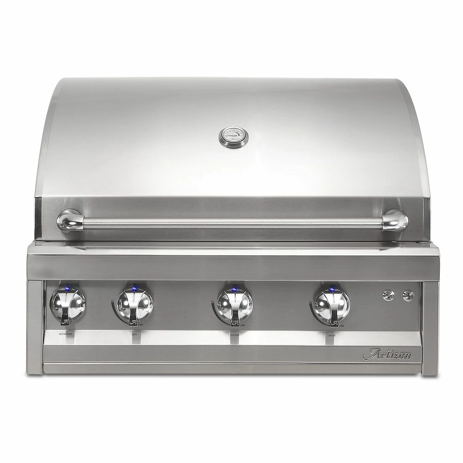 Artisan ARTP-32 Professional Series 32-Inch Built In Gas Grill provides a luxury grill package at an affordable price. Featuring commercial-grade 304 stainless steel construction, Artisan’s Professional Grills are meticulously crafted in the U.S.A. and designed for long-term durability. Heavy-duty 304 stainless steel burners offer high heat, while refractive five-way heat distributing briquettes offer even and radiant heat across the cooking surface. Durable stainless steel cooking grates with a special non-stick electro-polished finish offer restaurant quality cooking and easy cleaning, while an adjustable warming and grilling rack provides more versatile cooking options. Ergonomic grill knobs and brass valves offer precision flame control, while stainless steel ignition and lighting buttons are integrated into the control panel for easy operation. This grill also features an exclusive air-cooling plenum which blasts a curtain of cool air between the front control panel and the firebox to keep the front panel and bullnose cool to the touch.