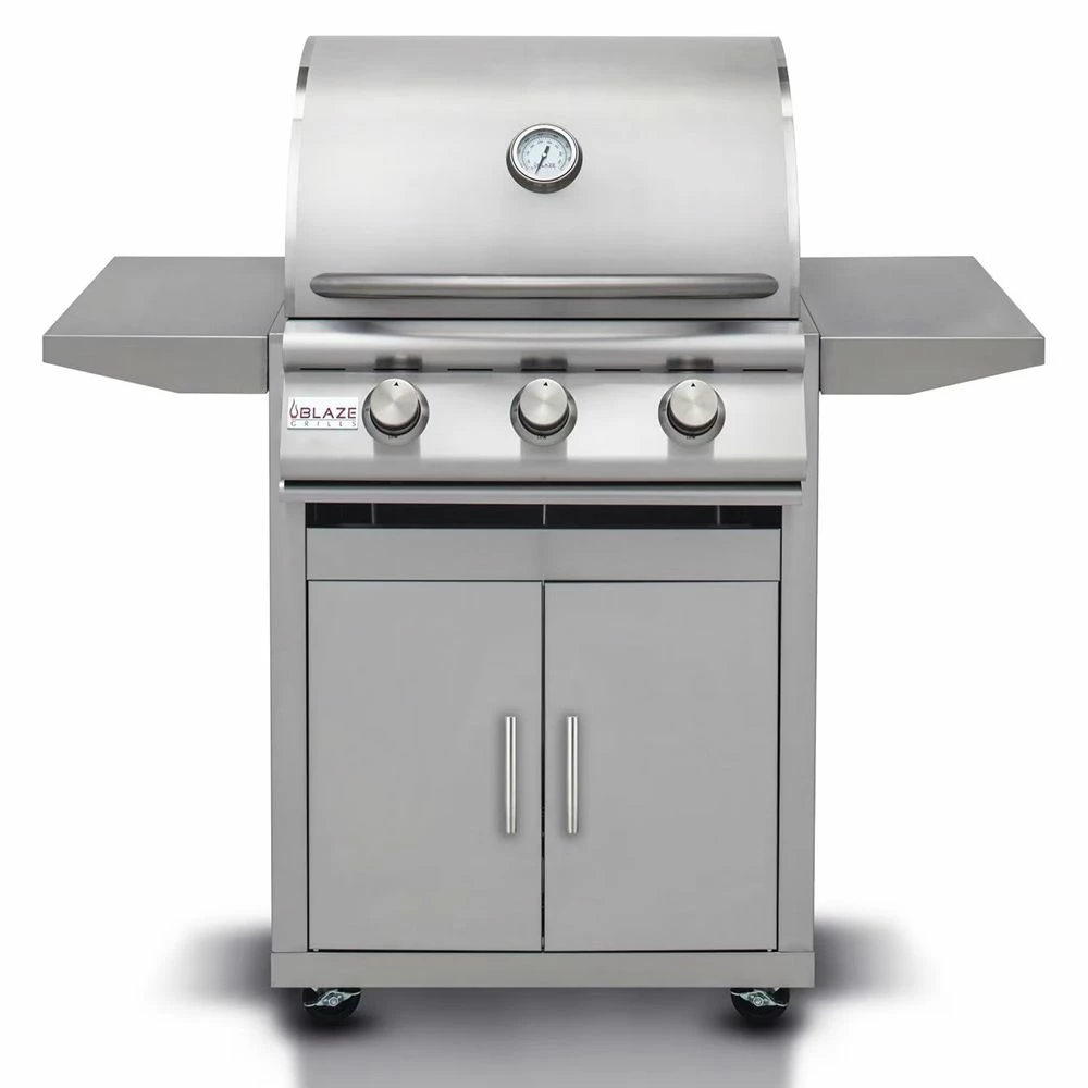 Blaze Prelude LBM Freestanding 3-Burner Gas Grill, 25-Inch offers the perfect grill for any entry-level griller. Featuring 304 stainless steel construction, this grill features premium durability and is even approved for multi-user settings, so you know your grill can withstand the rigors of frequent use. The quality grill hood is also double-lined to protect from heat discoloration to keep your grill looking and performing like new. Inside the grill, durable searing rods enhance your grilling experience, while stainless steel heat zone separators allow for different types of cooking zones across the grill surface–grill either directly or indirectly as you wish! The flame stabilizing grid minimizes flare-ups, while a full-width drip tray makes clean-up simple. This grill features 14,000 BTU of cooking power per burner for a total cooking surface of 42,000 BTUs. A push and turn flame-thrower ignition system makes ignition simple, while a backup flash tube ignition provides an alternate ignition option if necessary.