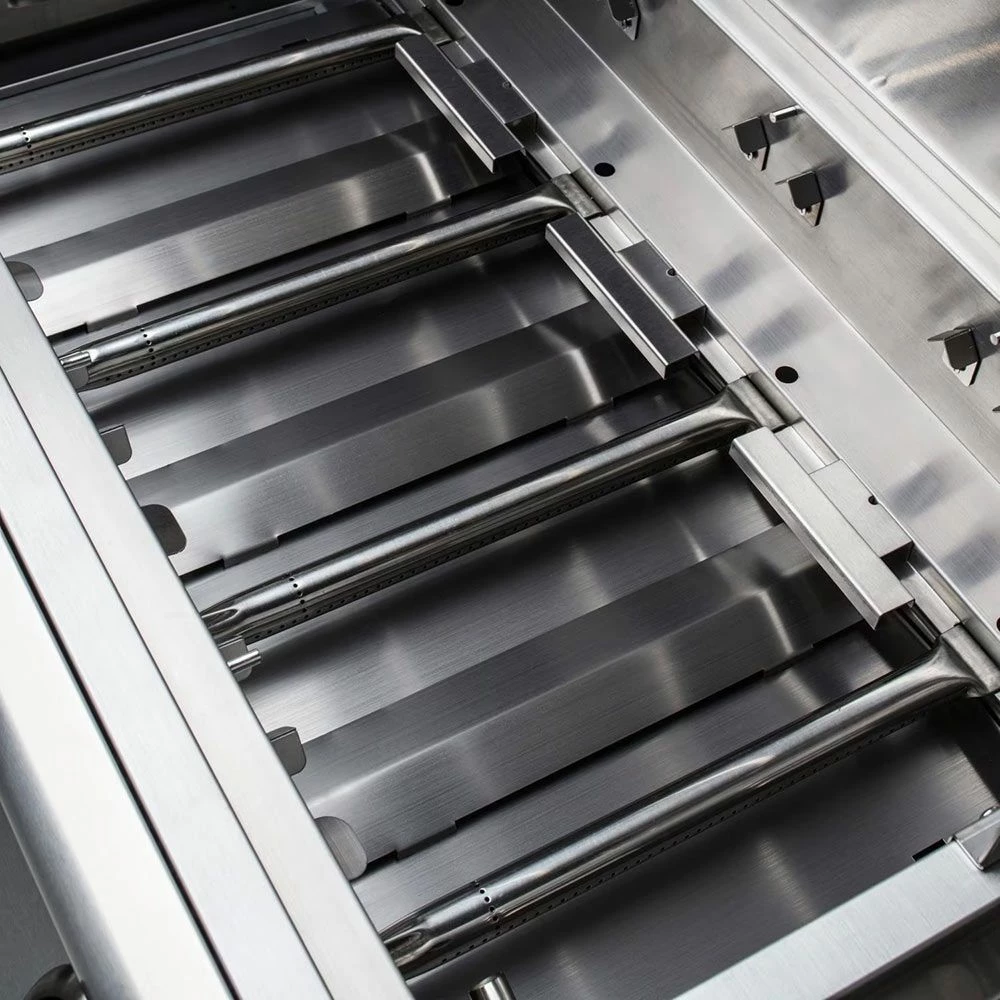 This grill includes a stainless steel grill cart with heavy-duty caster wheels to offer added mobility and convenience. Two front doors conceal a storage area for your propane tank, grill cover, or necessary grilling accessories, while two side shelves offer additional work space.