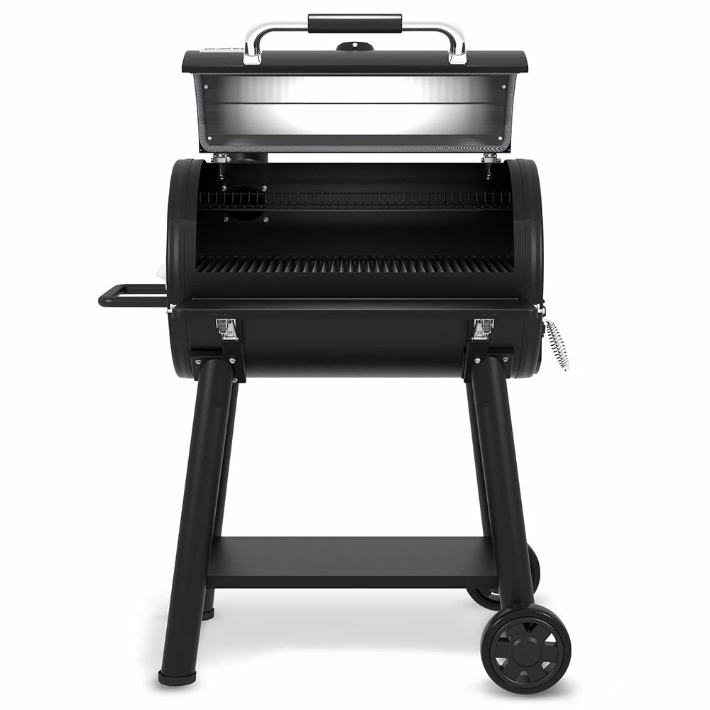 Broil King 948050 Regal Grill 500 Charcoal Smoker, 32-Inches offers a traditional southern-style barrel smoker for your outdoor kitchen. Featuring durable 2mm/14-gauge steel construction, this smoker offers exemplary durability and heat retention. Heavy-duty cast iron cooking grids offer a premium cooking surface, while cast aluminum Roto-Draft dampers offer impressive heat control. A durable steel cooking chamber offers supreme cooking capabilities, while dual-purpose smoke diffusing charcoal trays add to the flavor of your food. Removable front and bottom shelves offer added storage space and convenience, while removable stainless steel ash trays make cleanup simple. Two large eight-inch crack-proof wheels offer easy movement, while four durable steel legs with two leg levelers ensure stability.