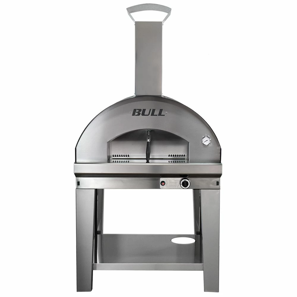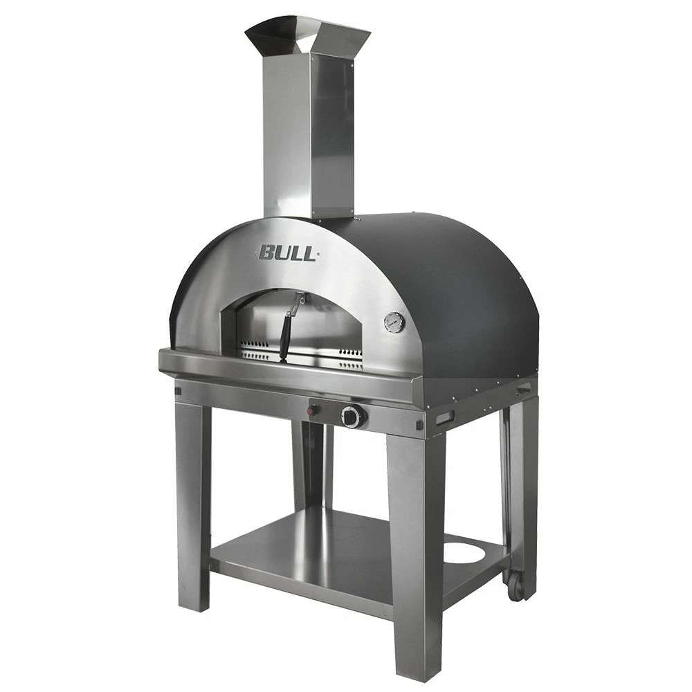 Bull BG-7765x Extra Large Gas Fired Italian Pizza Oven on Cart provides a high quality pizza cooking option to enhance your outdoor cooking and entertainment area. The XL On-Cart Pizza Oven is Italian-made and constructed from high grade 441 stainless steel to ensure durability and longevity and only requires 10 to 15 minutes to preheat. With a solid weld construction and rock base insulation, this pizza oven is as tough as they come and will not break down over time. The convenient slide out handles and caster wheels allow for easy mobility and placement for a perfect fit as part of your outdoor living area. The food-grade cooking stones help maintain intense heat and even heat distribution. With a portable profile and easy setup, the Bull pizza oven adds more versatility to your outdoor kitchen and is sure to keep your friends and family coming back for more.