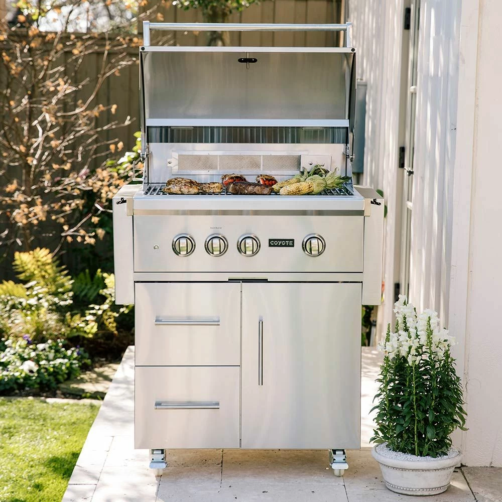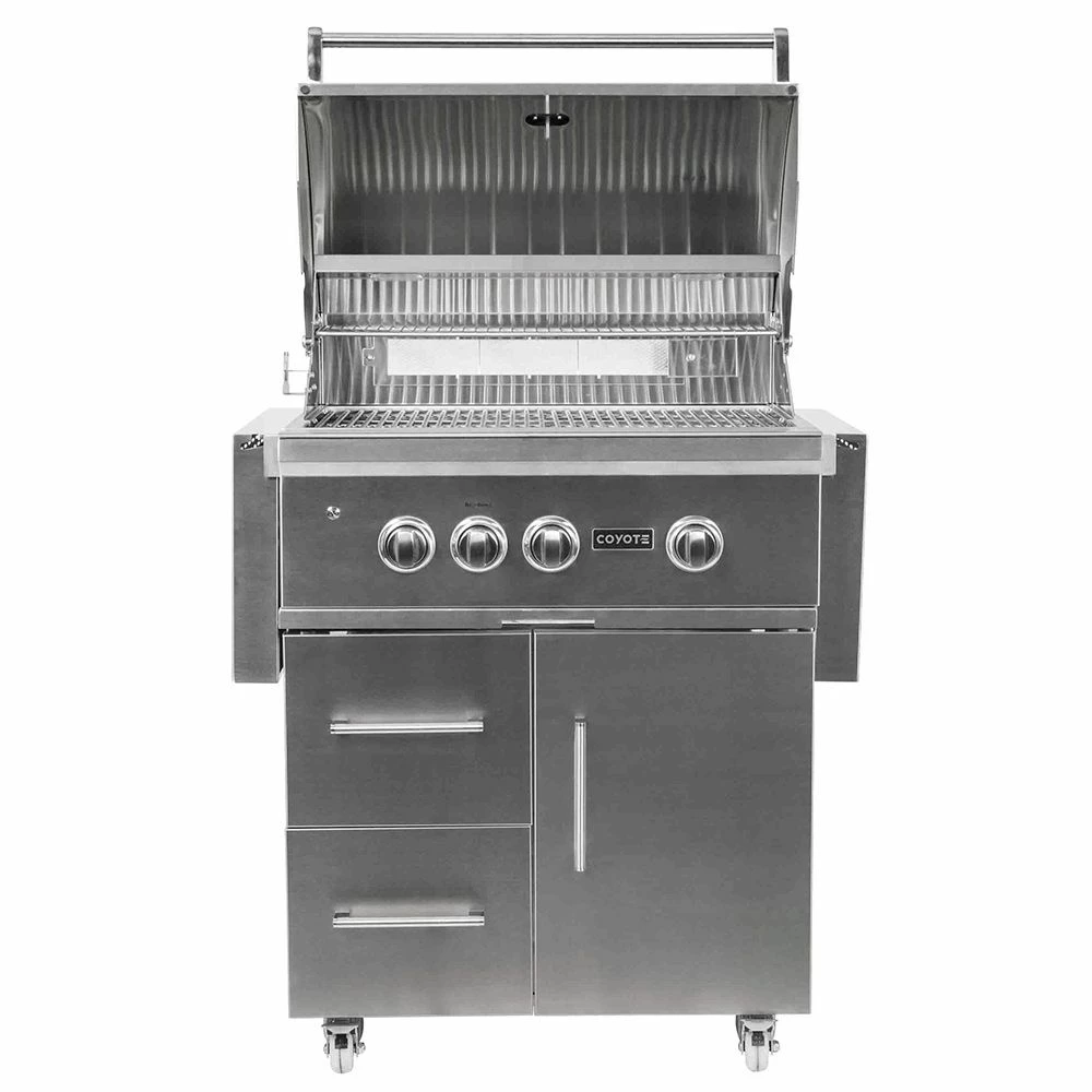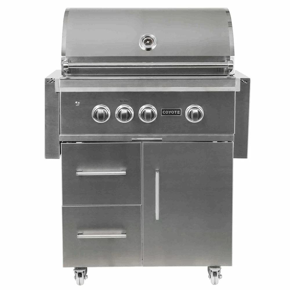 Coyote S-Series Stainless Steel Freestanding Gas Grill with Infrared Sear Burner & Rotisserie, 30-Inch (C2SL30-CT) provides a premium grilling option for your outdoor kitchen. The Coyote S-Series grill features complete 304 stainless steel construction and has been manufactured for high performance with two Coyote Infinity Burners, one Coyote RapidSear Burner and one infrared rear burner. Ceramic briquette heat control grids offer supreme radiant heating for better results across all 665 square inches of cooking space, while the included rotisserie kit and smoker box allow for expanded cooking options. Additional features include interior grill lighting for easier visibility in low-light conditions as well as LED illuminated control knobs. This base grill can also be upgraded with a variety of products and accessories custom built for this grill model (sold separately).