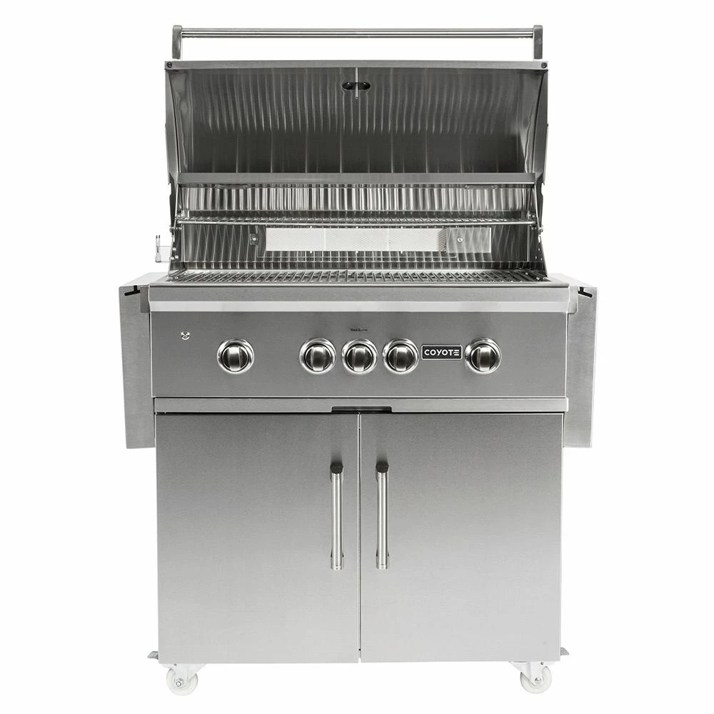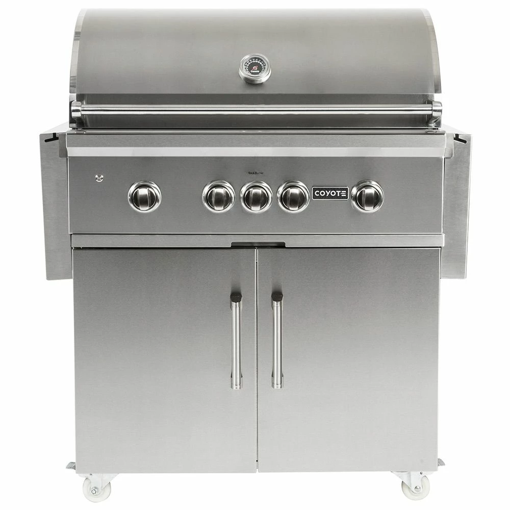 Coyote S-Series Stainless Steel Freestanding Gas Grill with Infrared Sear Burner & Rotisserie, 36-Inch (C2SL36-CT) provides a premium grilling option for your outdoor kitchen. The Coyote S-Series grill features complete 304 stainless steel construction and has been manufactured for high performance with three Coyote Infinity Burners, one Coyote RapidSear Burner and one infrared rear burner. Ceramic briquette heat control grids offer supreme radiant heating for better results across all 795 square inches of cooking space, while the included rotisserie kit and smoker box allow for expanded cooking options. Additional features include interior grill lighting for easier visibility in low-light conditions as well as LED illuminated control knobs. This base grill can also be upgraded with a variety of products and accessories custom built for this grill model (sold separately).