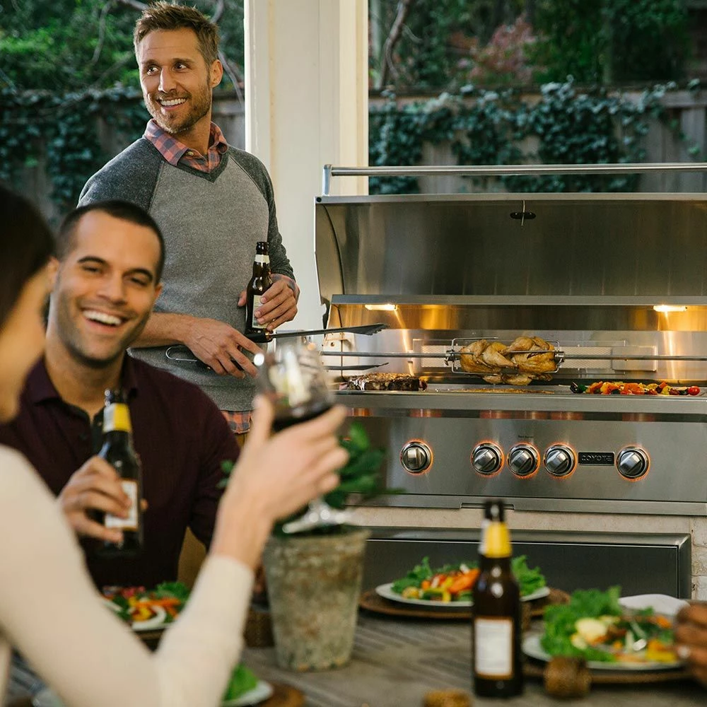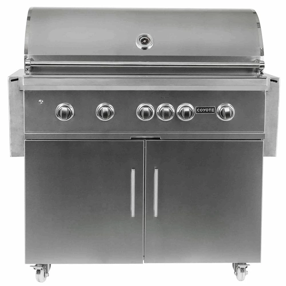 Coyote S-Series Stainless Steel Freestanding Gas Grill with Infrared Sear Burner & Rotisserie, 42-Inch (C2SL42-CT) provides a premium grilling option for your outdoor kitchen. The Coyote S-Series grill features complete 304 stainless steel construction and has been manufactured for high performance with four Coyote Infinity Burners, one Coyote RapidSear Burner and one infrared rear burner. Ceramic briquette heat control grids offer supreme radiant heating for better results across all 955 square inches of cooking space, while the included rotisserie kit and smoker box allow for expanded cooking options. Additional features include interior grill lighting for easier visibility in low-light conditions as well as LED illuminated control knobs. This base grill can also be upgraded with a variety of products and accessories custom built for this grill model (sold separately).