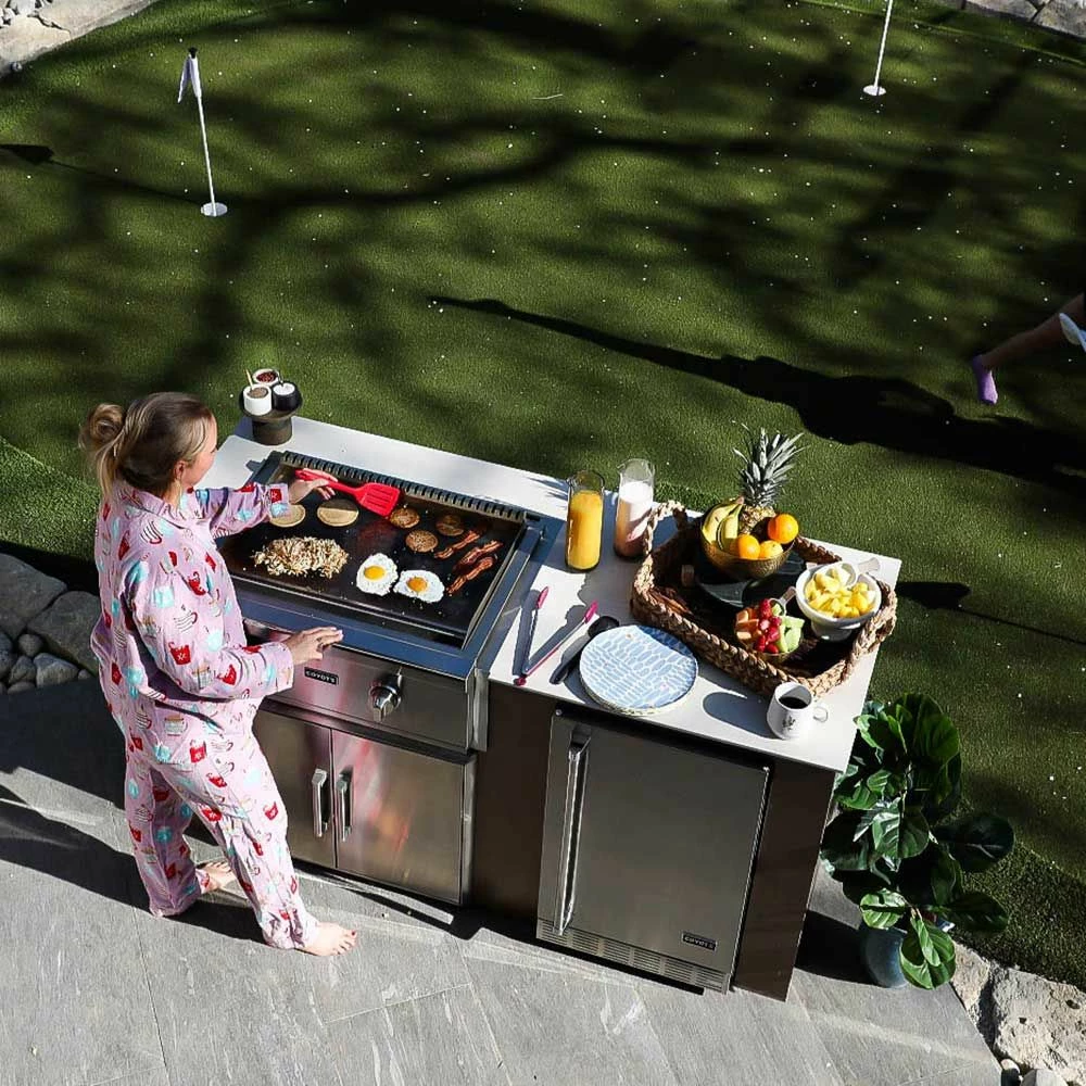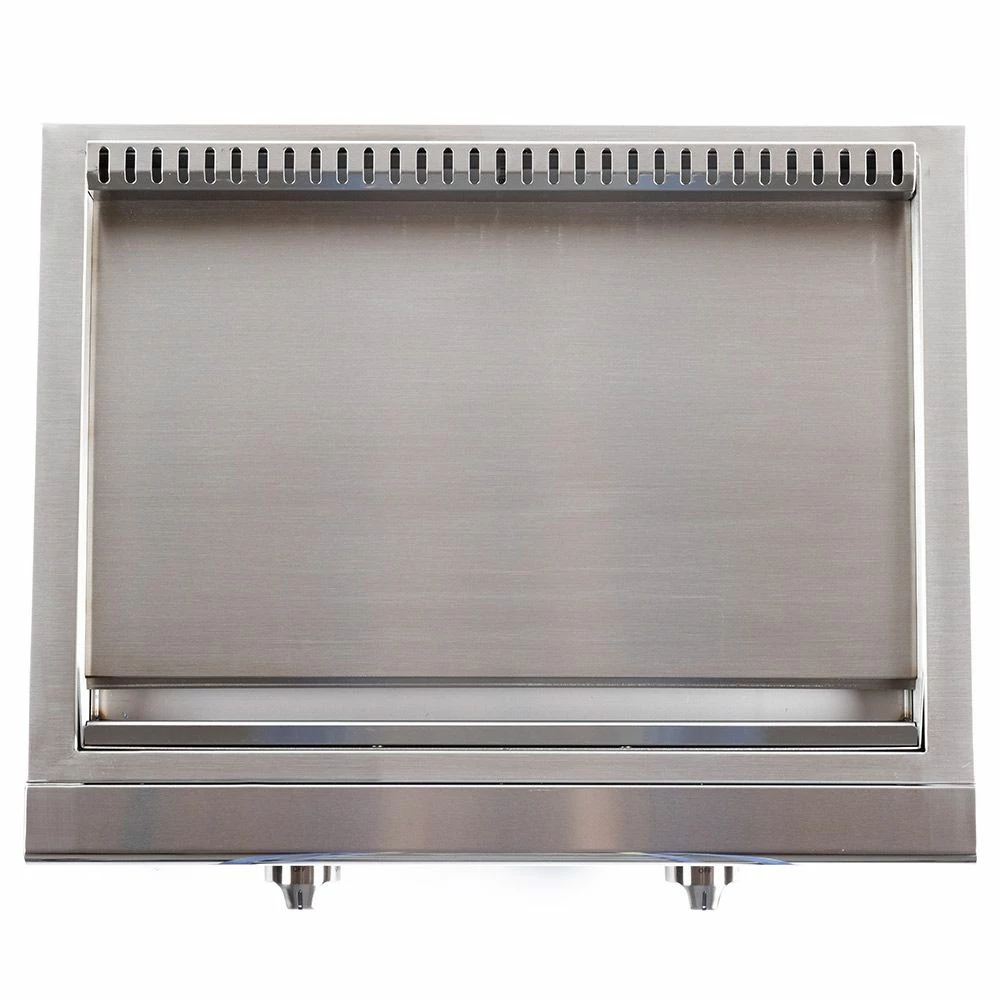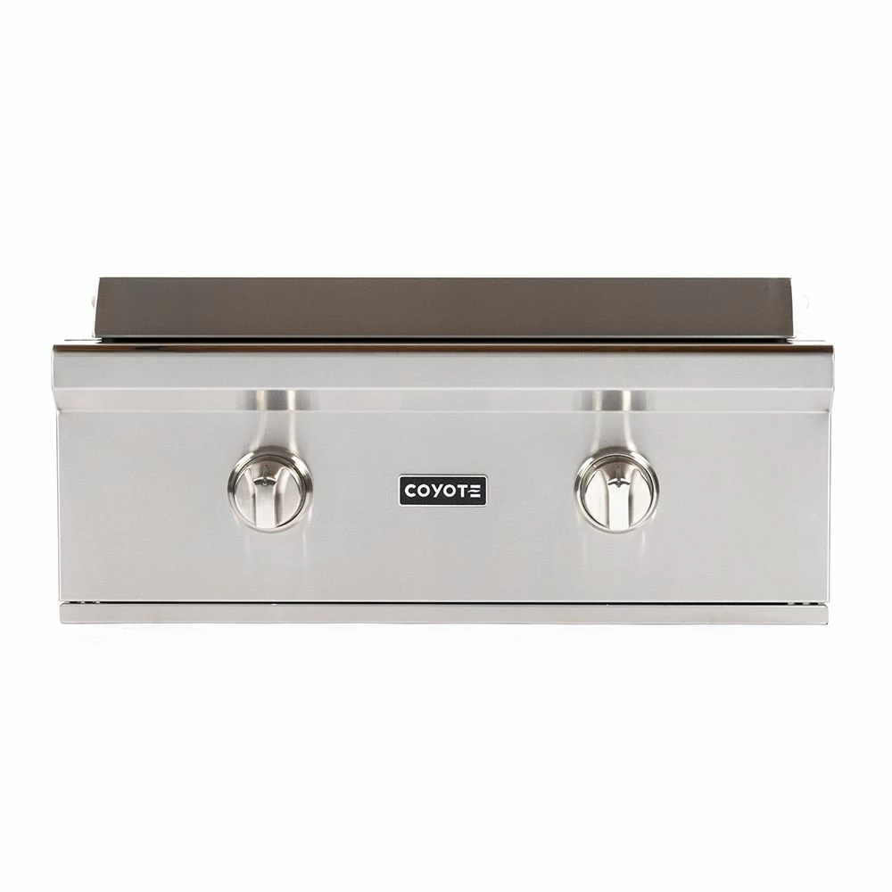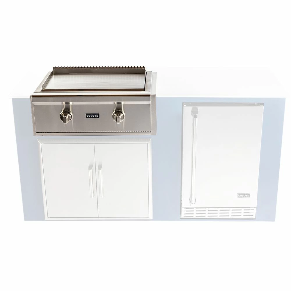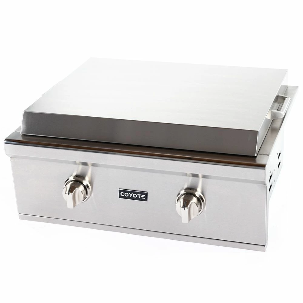 Coyote Stainless Steel Built-In Flat Top Gas Griddle, 30-Inch (C1FTG30) provides a premium grilling option for your outdoor kitchen. The Coyote flat top griddle features complete 304 stainless steel construction and has been manufactured for high performance with two individually controlled heating zones and a heavy gauge cooking surface for even heating across all 400 square inches of cooking space. Additional features include an LED gas supply safety light, stainless steel cover and removable grease trap.