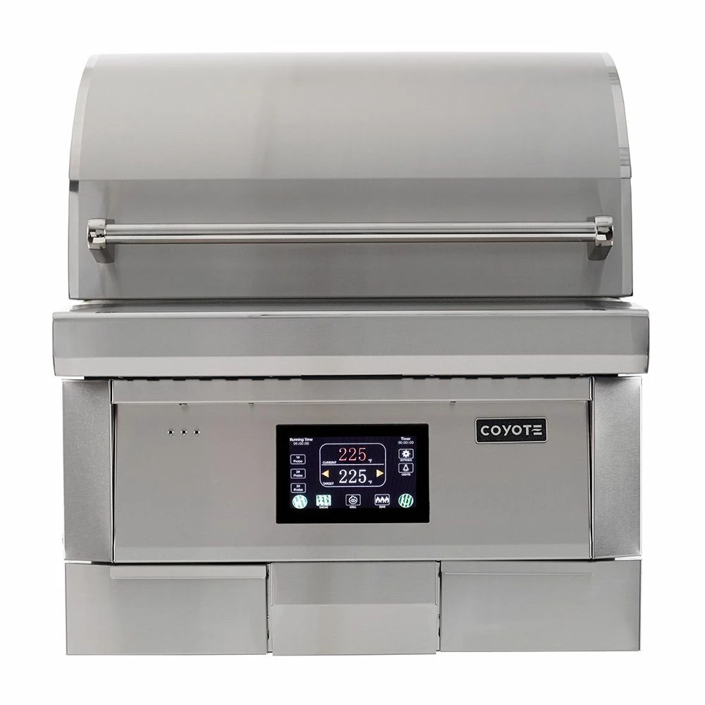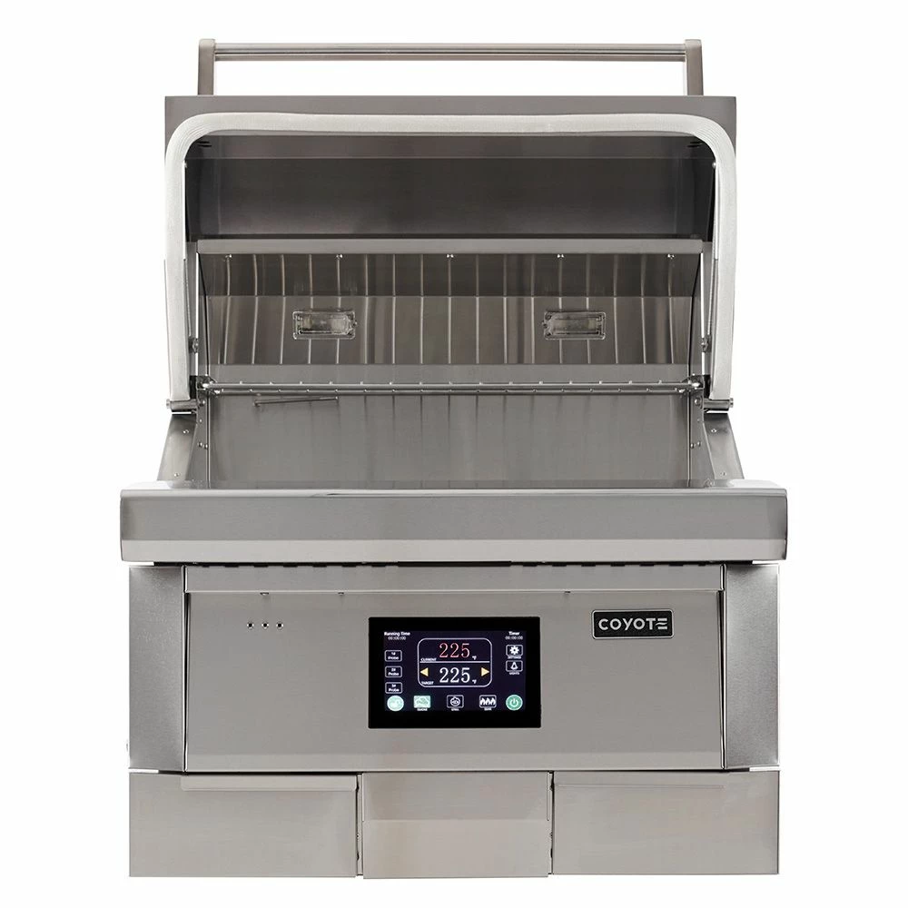 Coyote Stainless Steel Built-In Pellet Grill, 28-Inch (C1P28) provides a premium pellet grill option for your outdoor kitchen. Designed with ease-of-use in mind, this pellet grill takes the guesswork out of grilling with an intuitive digital touch display, Smart Drop pellet feed and three included temperature probes, so you’ll always know the conditions inside your grill. This grill features a temperature range of 175 degrees to 650 degrees Fahrenheit and features a 12-pound hopper capacity to allow for low-and-slow cooking, high temperature grilling and everything in between. A front-loading pellet hopper and spring assist hood make the grill even easier to use, while the Versa-Rack cooking system allows for cooking on multiple surfaces for greater cooking capacity. Additional user-friendly features include interior lighting, a temperature probe LED and an electronic power ignition.