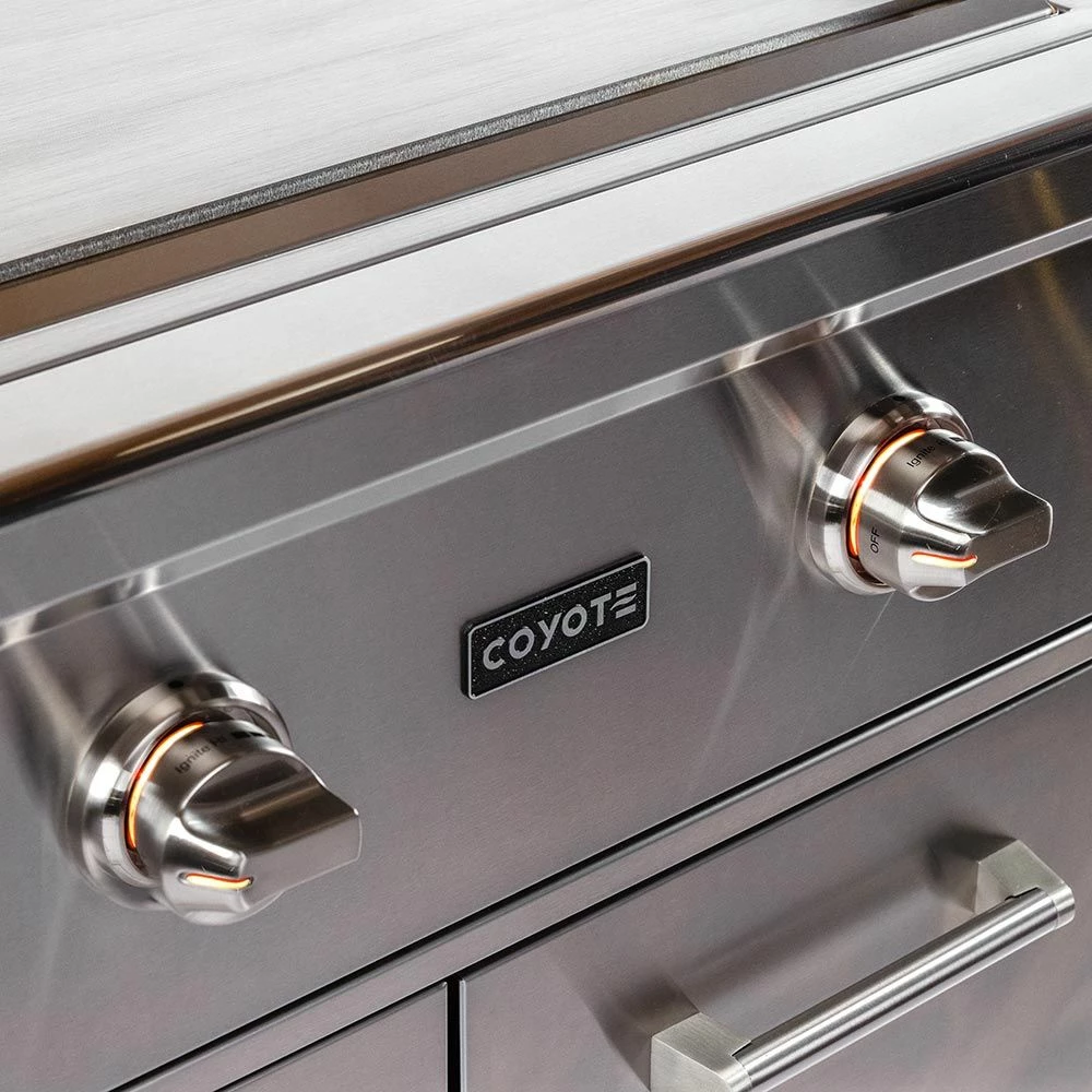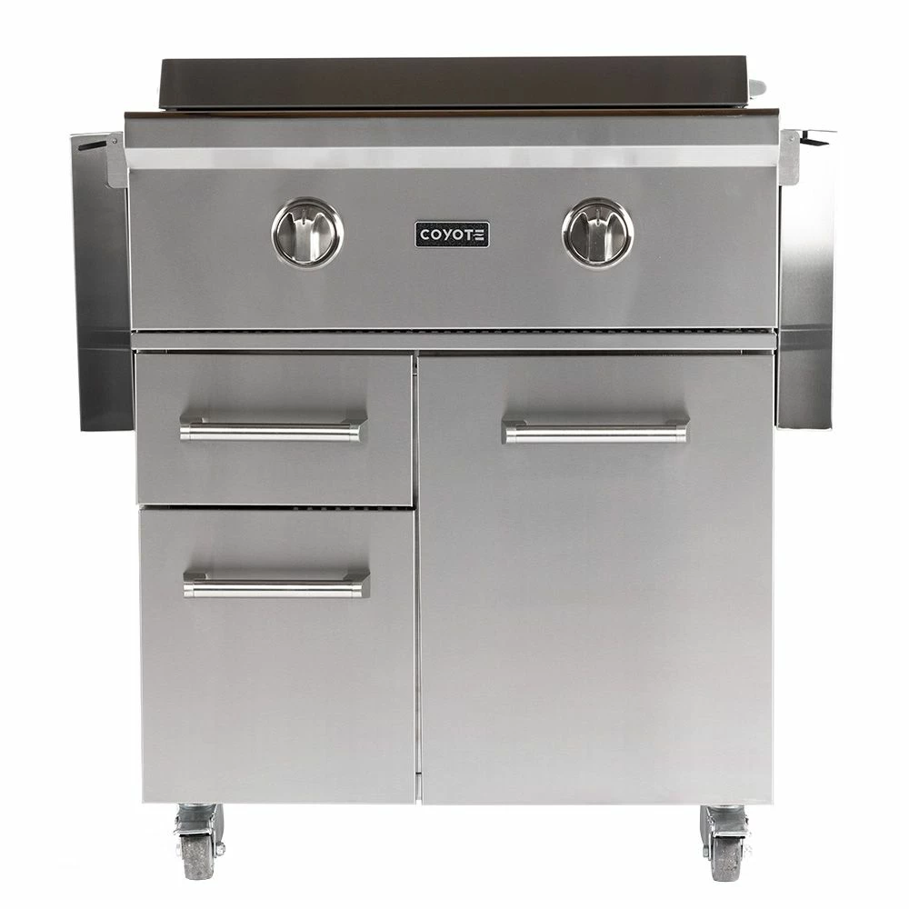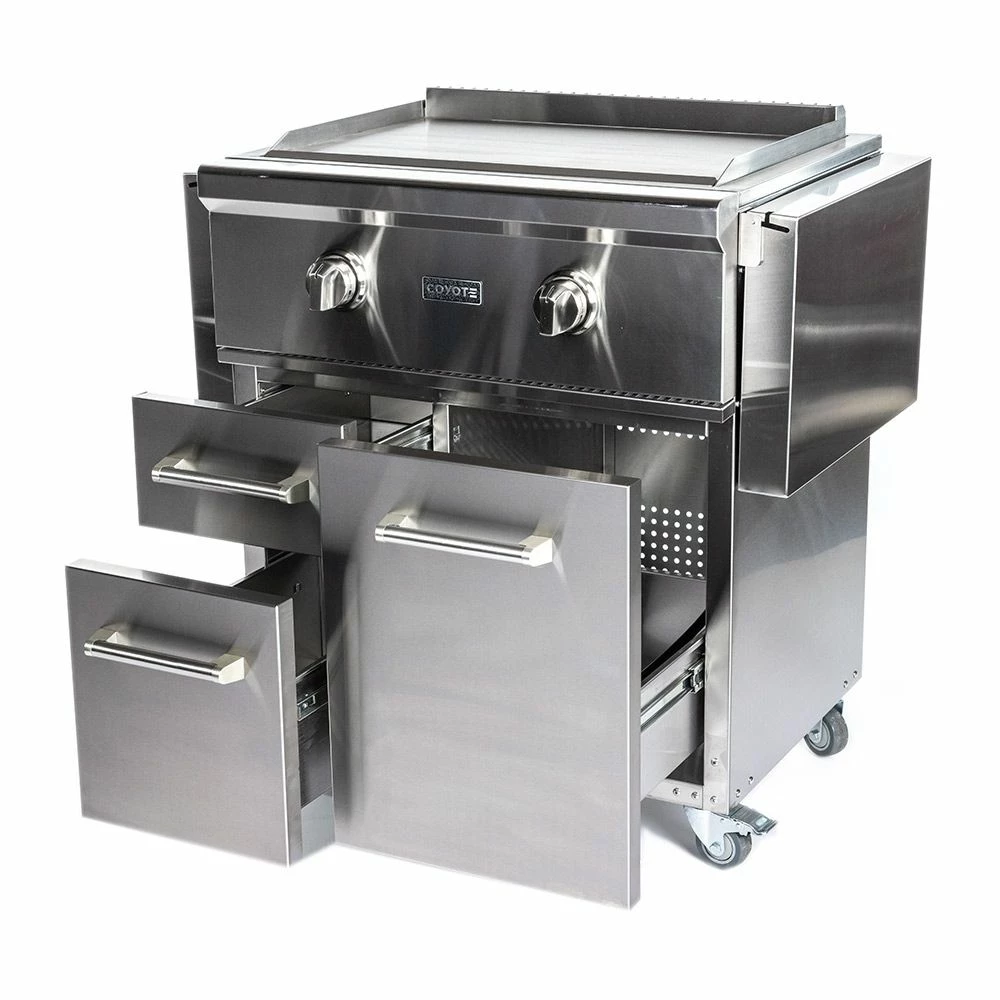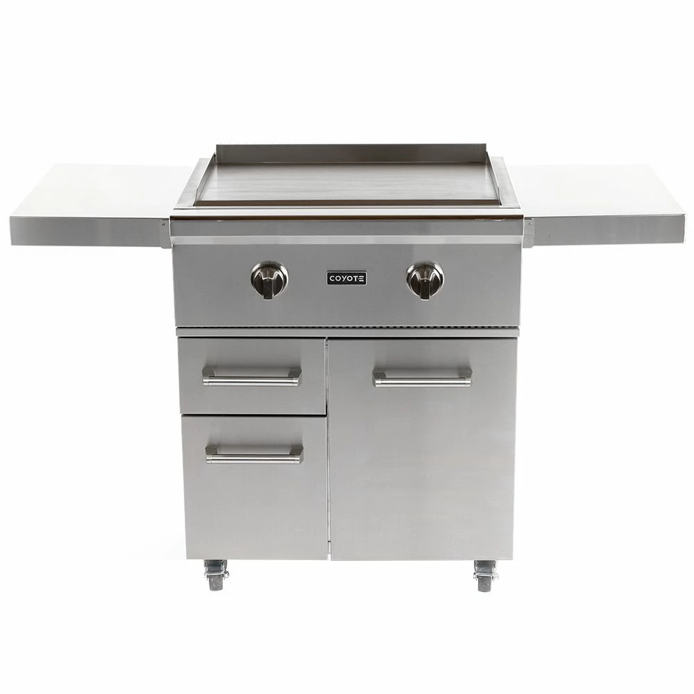 Coyote Stainless Steel Freestanding Flat Top Gas Griddle, 30-Inch (C1FTG30-CT) provides a premium grilling option for your outdoor kitchen. The Coyote flat top griddle features complete 304 stainless steel construction and has been manufactured for high performance with two individually controlled heating zones and a heavy gauge cooking surface for even heating across all 400 square inches of cooking space. Additional features include an LED gas supply safety light, stainless steel cover and removable grease trap. The cart features a pair of drawers that provide storage space for all your tools and accessories. Fold down side shelves offer space when you need it and extra room when you don’t, while industrial-quality locking casters offer easy movement. The largest drawer offers the perfect space for propane tank storage (if applicable), and the entire cart comes fully assembled for easy installation.