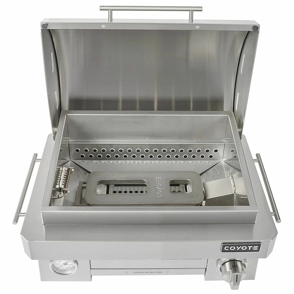 Coyote Stainless Steel Portable Grill, Propane (C1PORTLP) provides a premium portable grilling option. With a 200-square-inch cooking surface and the Coyote Signature Grate design, this grill delivers a high quality cooking experience in a convenient design. The Coyote Portable Grill also features 316 marine grade stainless steel construction for superior durability. Under the hood, the grill’s Coyote Infinity burner delivers 20,000 BTU and a maximum temperature of 700 degrees Fahrenheit, while the ceramic heat control grid delivers impressive results every time you cook. For added convenience, this grill can be used with either a 20-pound standard grill propane tank or a small propane cannister (adapter included).