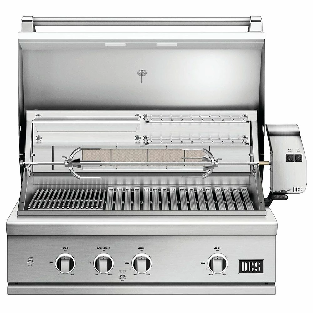 DCS BE1-36RC Series 9 36-Inch Built-In Gas Grill with Rotisserie offers one of the most advanced BBQ grills on the market featuring a superior design and high end quality for unparalleled cooking performance. This grill features a complete 304 stainless steel construction to provide maximum durability designed to withstand the rigors of the outdoors. The double sided cast stainless steel grill grates feature one side with a gentle radius for handling delicate foods while the other side features a W shape for perfect sear lines and the dual position settings allow a flat or angled grill surface for a versatile grilling experience. In the angled setting, the patented Grease Management Systemâ„¢ channels grease and oils away from the flames to prevent flare ups and simplify the cleaning process.
