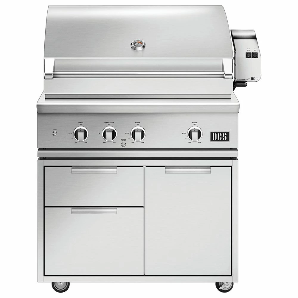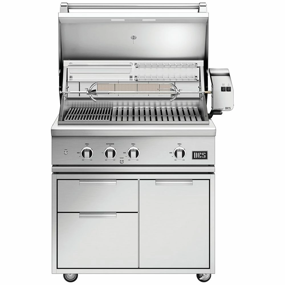 DCS BE1-36RC Series 9 36-Inch Freestanding Gas Grill with Rotisserie offers one of the most advanced BBQ grills on the market featuring a superior design and high end quality for unparalleled cooking performance. This grill features a complete 304 stainless steel construction to provide maximum durability designed to withstand the rigors of the outdoors. The double sided cast stainless steel grill grates feature one side with a gentle radius for handling delicate foods while the other side features a W shape for perfect sear lines and the dual position settings allow a flat or angled grill surface for a versatile grilling experience. In the angled setting, the patented Grease Management Systemâ„¢ channels grease and oils away from the flames to prevent flare ups and simplify the cleaning process.