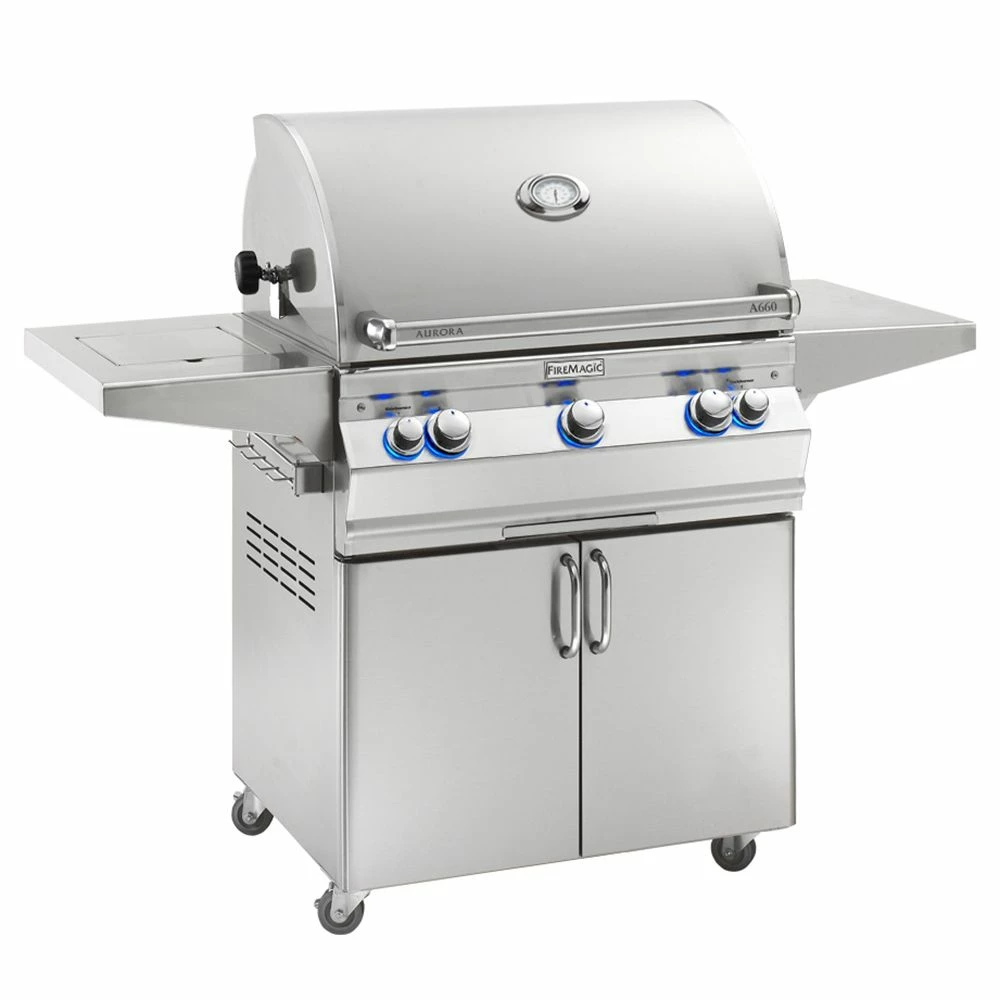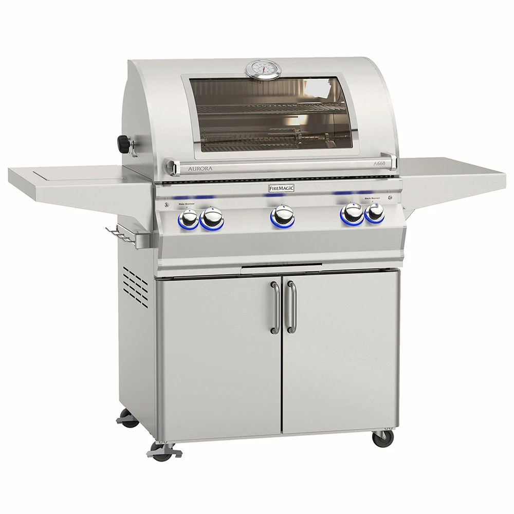 Fire Magic A660s Aurora Gas Grill on Cart with Single Side Burner provides a high end grill that’s crafted for cooking versatility, durability and longevity – truly a grill of superior design and engineering. The complete 304 stainless steel construction is highlighted by the cast stainless steel “E” burners capable of up to 25,000 BTU each. Fire Magic’s Diamond Sear Cooking Grids provide optimal heat transfer while the 16 gauge stainless steel flavor grids are specially designed to provide even heat distribution preventing hot and cold zones and protect the burners from grease and drippings. The modest 660in² grilling surface offers plenty of grilling area while the optional 18,000 BTU back burner comes with a heavy duty rotisserie kit for professional style cooking. The freestanding grill cart features the same 304 stainless steel construction with (2) access doors, (2) side shelves – one features a 15,000 BTU side burner, and heavy duty casters for easy mobility.