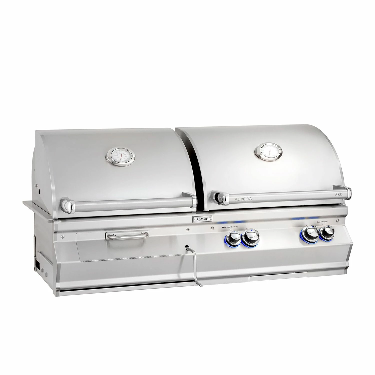 Fire Magic A830i Aurora Built-In Gas & Charcoal Combination Grill offers one of the most unique grills on the market – combining the functionality of gas and the flavor of charcoal. Crafted for cooking versatility, durability and longevity the Aurora Gas/Charcoal combo grill is truly a grill of superior design and engineering. The gas component features (2) burners capable of up to 25,000 BTU each with a modest 432in² gas grilling surface that features an optional 13,000 BTU backburner with heavy duty rotisserie kit; while the Charcoal component has a dedicated 26,000 BTU charcoal ignitor and a modest 396in² charcoal grilling surface. Additionally, Fire Magic’s Diamond Sear Cooking Grids provide optimal heat transfer with more surface area and contact points to assist in searing performance. From the cast stainless steel “E” burners to the built in charcoal crank, each feature is designed for high quality performance and durability.