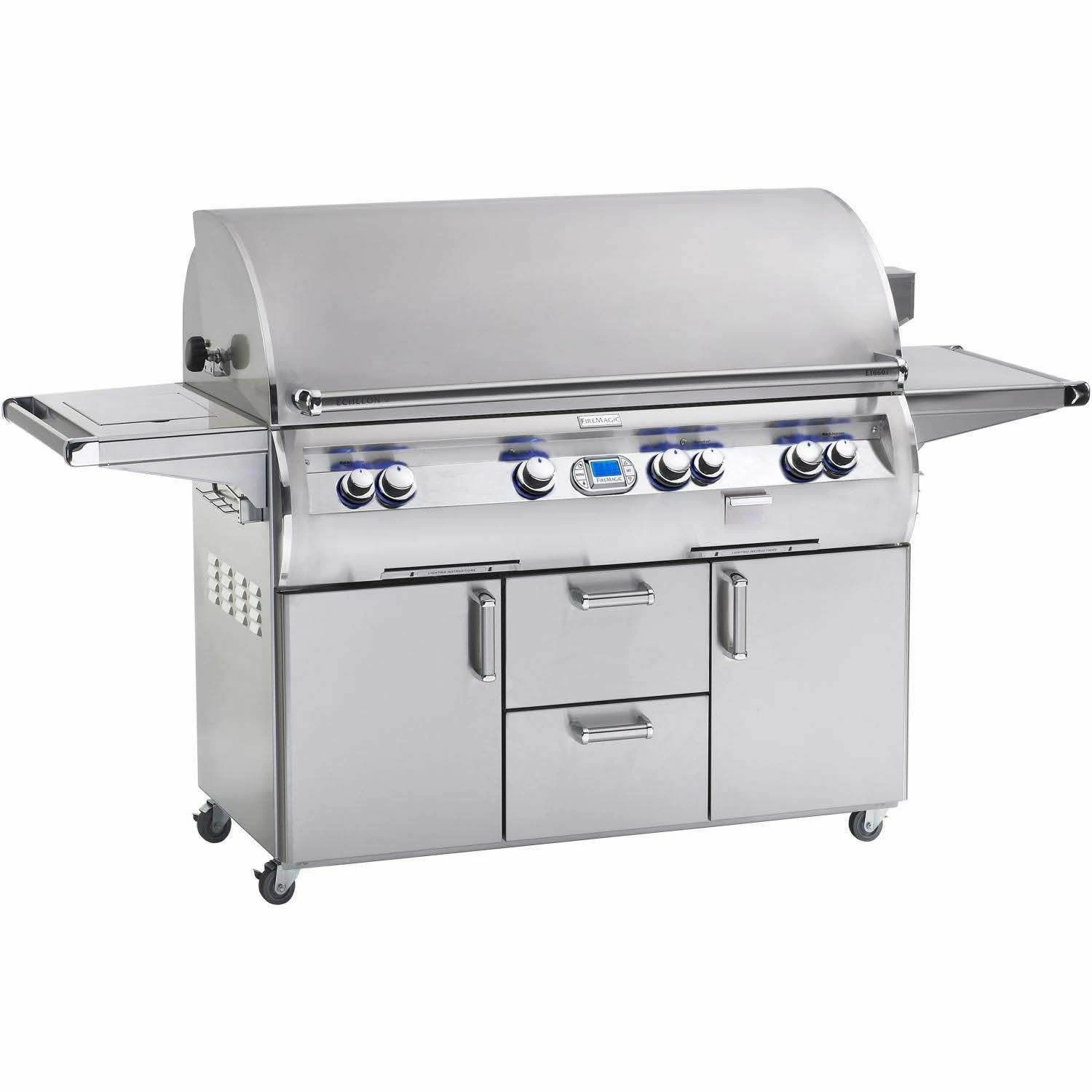 Fire Magic E1060s Echelon Diamond Gas Grill on Cart with Single Side Burner provides the ultimate high end grill that’s crafted for cooking versatility, durability and longevity – truly a grill of masterful design and engineering. The complete 304 stainless steel construction is highlighted by cast stainless steel “E” burners capable of up to 28,000 BTU each. Fire Magic’s Diamond Sear Cooking Grids provide optimal heat transfer while the 16 gauge stainless steel flavor grids are specially designed to provide even heat distribution preventing hot and cold zones and protect the burners from grease and drippings. The very large 1056in² grilling surface offers plenty of grilling area while the (2) Quantum rotisserie back burners are rated for 11,000 BTU each and include the super heavy duty rotisserie kit for professional style cooking. The double walled, spring assisted grill hood features an ergonomic design with a 12″ firebox to offer complete convection cooking that’s topped off with a charcoal/smoker basket for more flavor options. The stainless steel grill cart features the same high quality construction while including heavy duty casters for mobility, (2) side shelves, and a 15,000 BTU Side Burner.