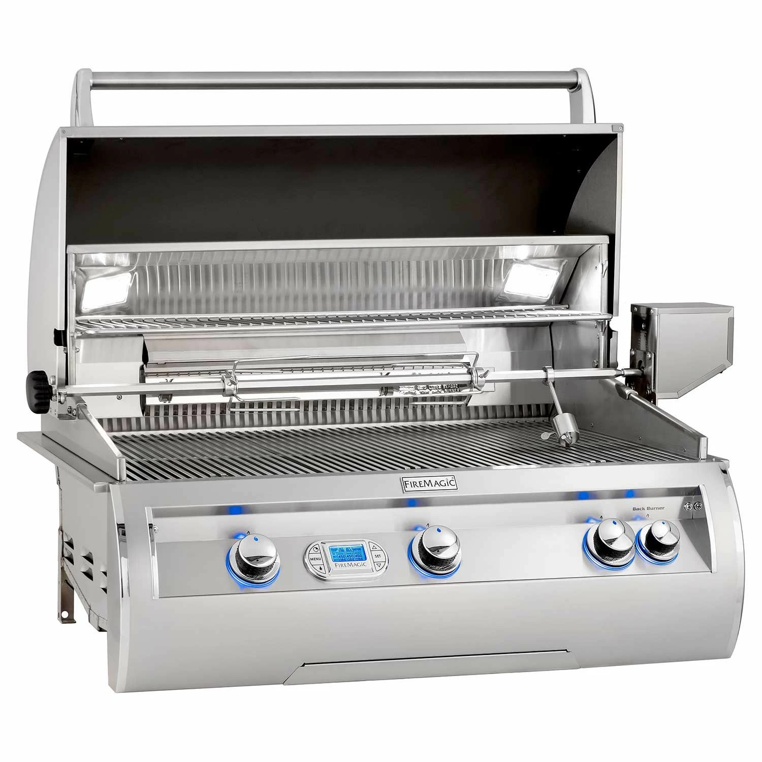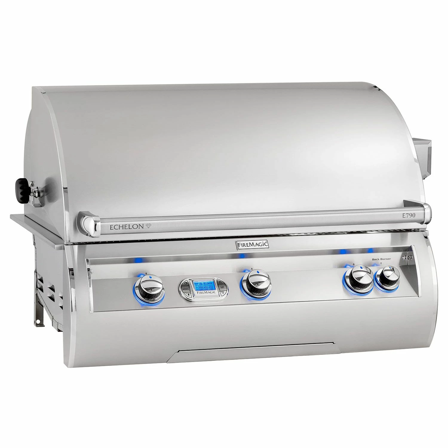Fire Magic E790i Echelon Diamond Built-In Gas Grill provides the ultimate high end grill that’s crafted for cooking versatility, durability and longevity – truly a grill of masterful design and engineering. The complete 304 stainless steel construction is highlighted by cast stainless steel “E” burners capable of up to 33,000 BTU each. Fire Magic’s Diamond Sear Cooking Grids provide optimal heat transfer while the 16 gauge stainless steel flavor grids are specially designed to provide even heat distribution preventing hot and cold zones and protect the burners from grease and drippings. The large 792in² grilling surface offers plenty of grilling area while the Quantum rotisserie back burner is rated for 13,000 BTU and includes the heavy duty rotisserie kit for professional style cooking. The double walled, spring assisted grill hood features an ergonomic design with a 12″ firebox to offer complete convection cooking that’s topped off with a charcoal/smoker basket for more flavor options.