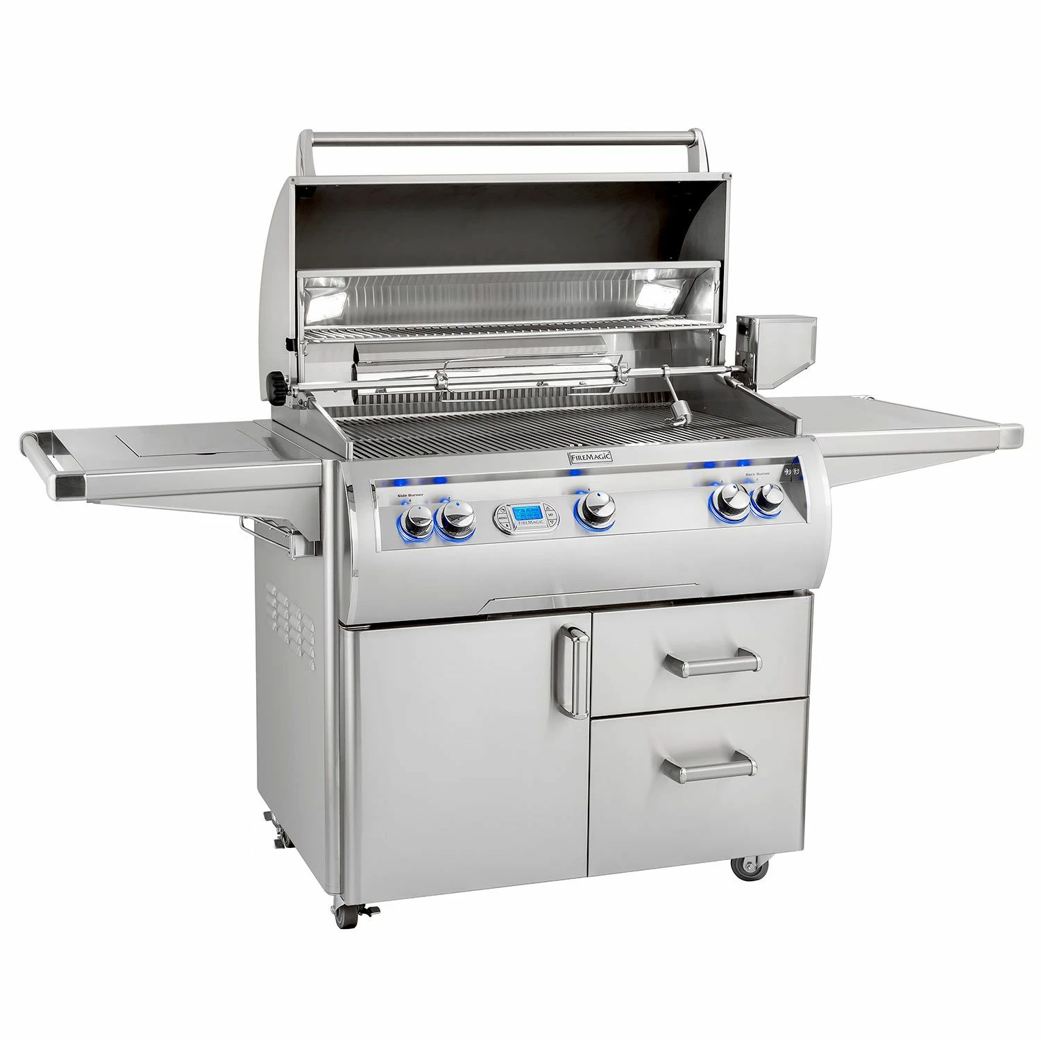 Fire Magic E790s Echelon Diamond Gas Grill on Cart with Double Side Burner provides the ultimate high end grill that’s crafted for cooking versatility, durability and longevity – truly a grill of masterful design and engineering. The complete 304 stainless steel construction is highlighted by cast stainless steel “E” burners capable of up to 33,000 BTU each. Fire Magic’s Diamond Sear Cooking Grids provide optimal heat transfer while the 16 gauge stainless steel flavor grids are specially designed to provide even heat distribution preventing hot and cold zones and protect the burners from grease and drippings. The large 790in² grilling surface offers plenty of grilling area while the Quantum rotisserie back burner is rated for 13,000 BTU and includes the heavy duty rotisserie kit for professional style cooking. The double walled, spring assisted grill hood features an ergonomic design with a 12″ firebox to offer complete convection cooking that’s topped off with a charcoal/smoker basket for more flavor options. The stainless steel grill cart features the same high quality construction while including heavy duty casters for mobility, (2) side shelves, and a 30,000 BTU Double Side Burner.
