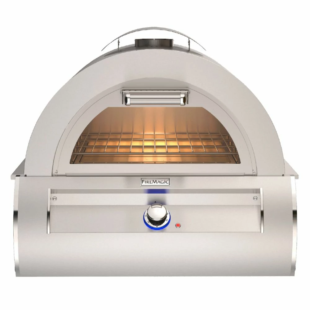 Fire Magic Stainless Steel Built-In Gas Pizza Oven, 30-Inch provides a high quality upgrade for your outdoor kitchen, combining durable, corrosion resistant construction with a high-power 36k BTU stainless steel burner for a total performance package. It features a three layer dome and ceramic glass door viewing window to keep heat inside the cooking chamber where it belongs. Smart features like an LED control knob, gravity latch lock and interior lighting for convenience and ease of use. This oven is equipped with a baking rack, pizza peel and Cordierite stone to provide flexible options for making pizza, bread and desserts with ease. You’ll be getting more mileage out of your outdoor kitchen with this gas pizza oven by Fire Magic.