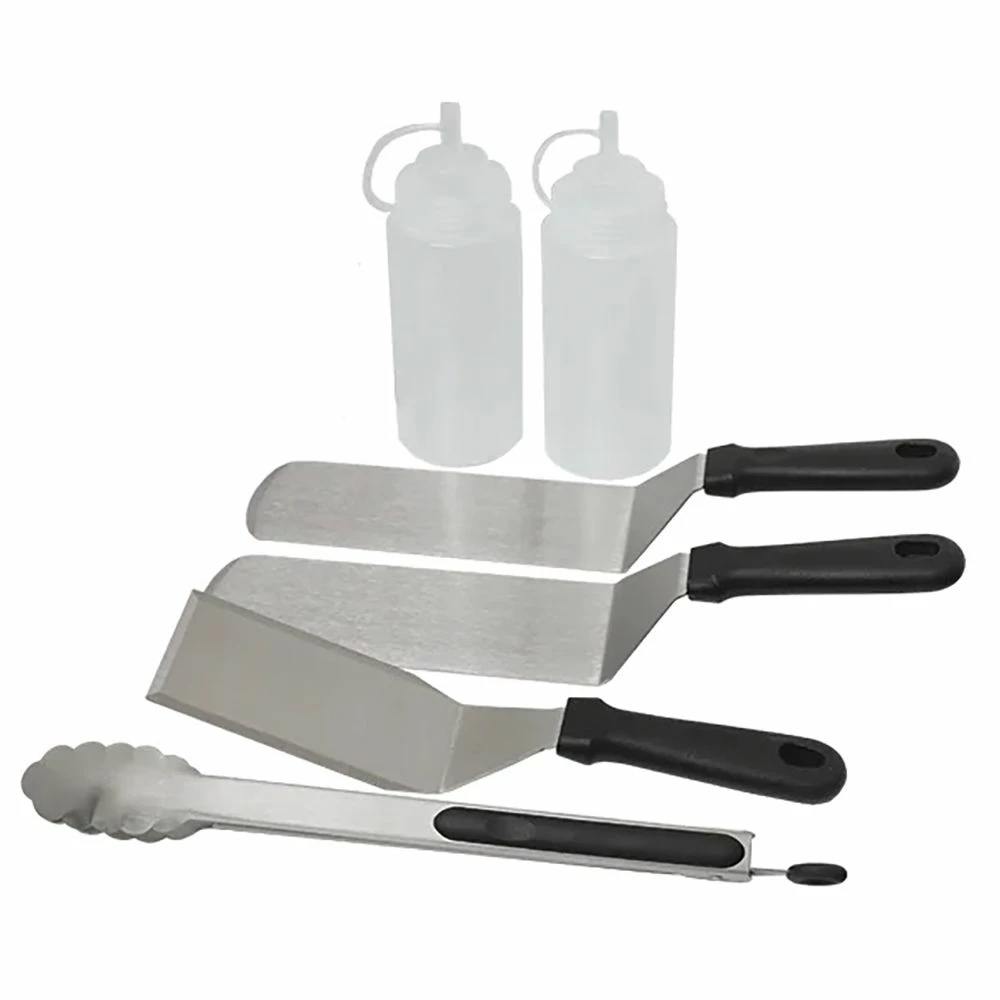 - Includes two cooking spatulas, one cleaning spatula, one set of tongs, and two squeeze bottles