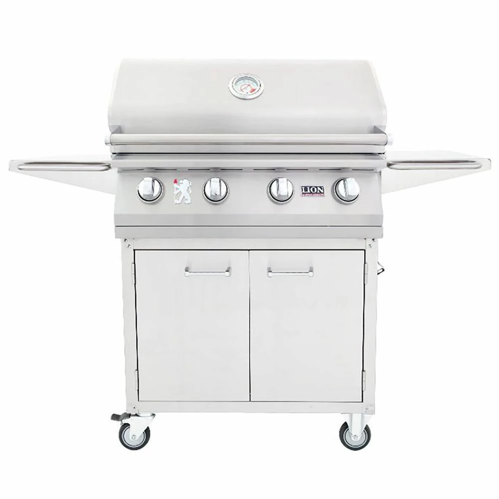 Lion L65000 32-Inch Freestanding Grill provides a premium built-in gas grill for your outdoor kitchen. With commercial-grade, 16-gauge 304 stainless steel, this unit has been built to withstand many years of outdoor grilling. Four cast stainless steel burners offer 60,000 total BTU heat output for a high-end experience. These burners also feature a lifetime warranty for added insurance. An XL commercial temperature gauge stands out in the double layer seamless welded smoker head for impressive aesthetics and performance, while four commercial push-to-turn knobs offer a quality feel on the control panel. Inside the grill, a 830-square-inch cooking surface provides ample room for food, while an adjustable warming rack expands your grilling options. This grill also includes a cover to protect for added protection when not in use.