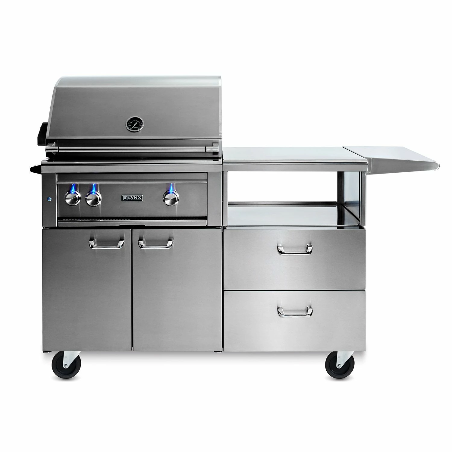 Lynx L30-LMKC54 Professional Gas Grill On Mobile Kitchen Cart, 30-Inch combines innovative features, unparalleled performance, and superior craftsmanship to create one of the most advanced grills on the market. This BBQ grill features a heavy 16-gauge 304 stainless steel construction with smooth welded joints and polished mirrored edges for a blend of style and durability that will stand up to the elements in any climate. Designed for professional-style performance, the premium ceramic burners provide a whopping 25,000 BTU for extreme high heat output that’s evenly distributed while the ceramic radiant briquettes provide a charcoal-like infrared heat for an enhanced gas grilling experience. With LED backlit control knobs, internal halogen grill lights, a removable smoker box, rotisserie system with infrared rear burner, and a hot-surface ignition, this unit combines all of the requisite features of a high-end grill and then some – so you can create the best barbecue.