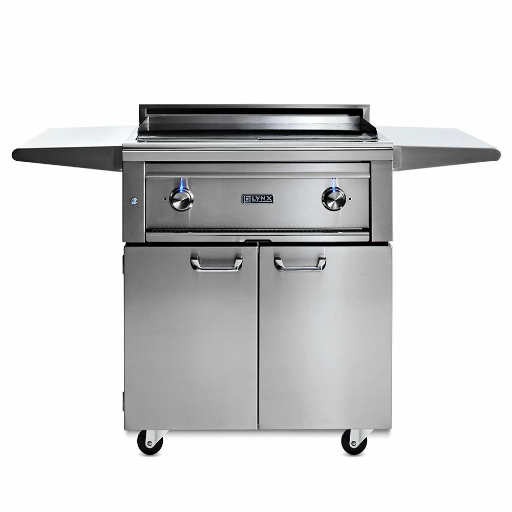 Lynx L30AG-CART Asado Gas Grill On Cart, 30-Inch offers the perfect compliment to any outdoor kitchen. The unique multi-layer grilling surface combines a thick layer of aluminum sandwiched between two sheets of stainless steel to provide even heat distribution across the entire span of the grilling surface while the 304 stainless steel ensures a long lasting durability. Underneath the All-Clad grilling surface are two Tridentâ„¢ infrared burners rated at 23,000 BTU each to provide responsive temperature control over the entire grill surface. This BBQ grill features a heavy 16-gauge 304 stainless steel construction with smooth welded joints and polished mirrored edges for a blend of style and durability that will stand up to the elements in any climate. With LED backlit control knobs and a hot-surface ignition this unit combines all of the requisite features of a high-end grill and then some – so you can create the best barbecue.