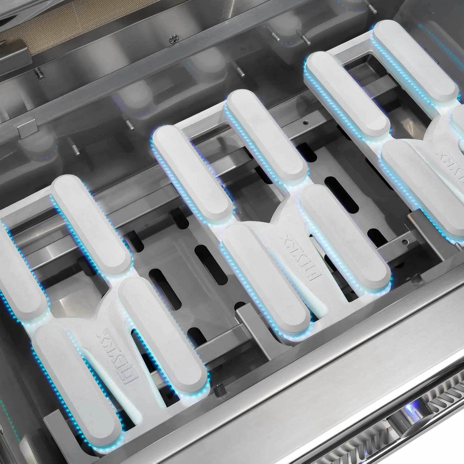 - Full-Feature Lighting The integrated interior halogen lights shine bright on the grill surface to allow even late night grilling while the backlit LED control knobs provide an aesthetic enhancement to the sleek design for an overall contemporary look