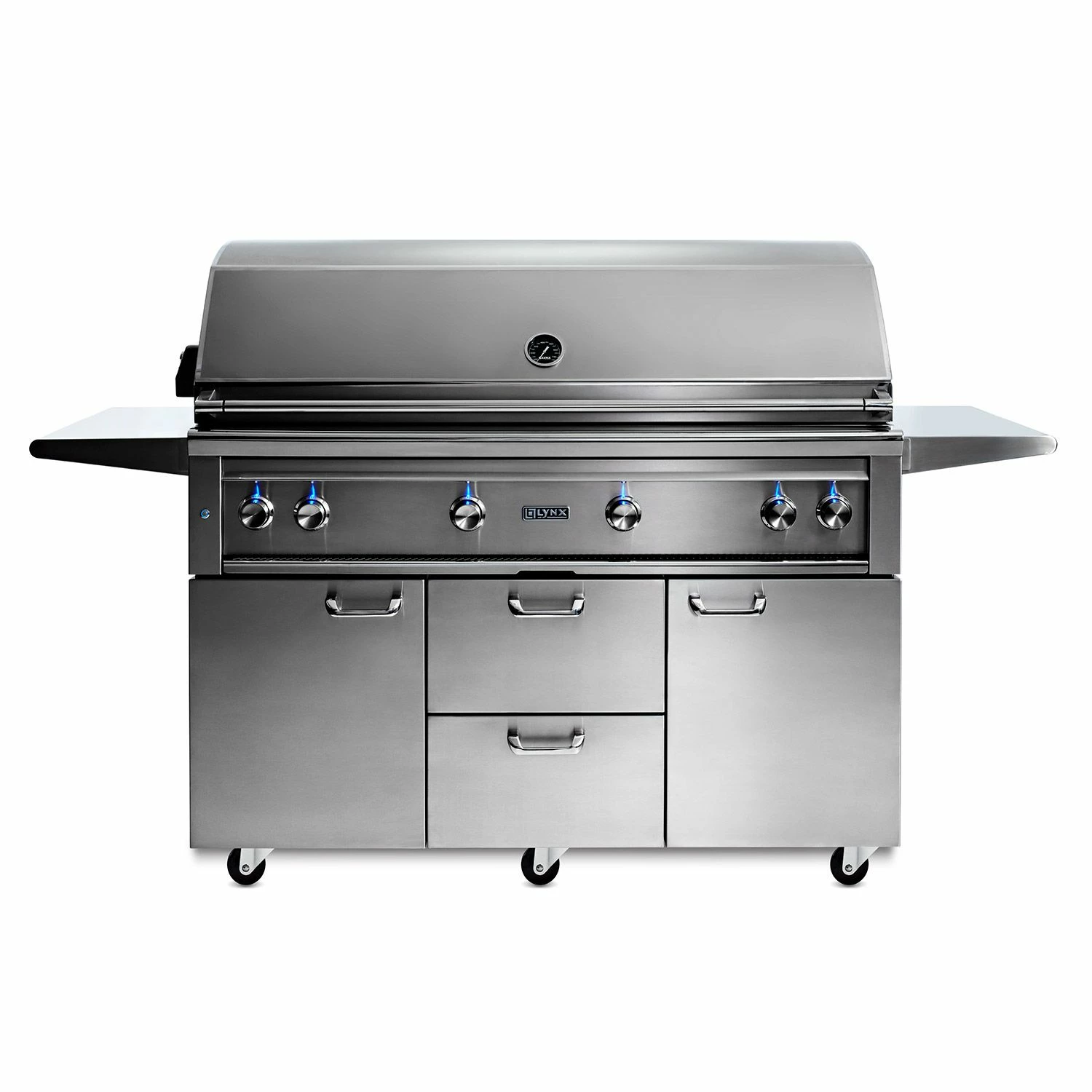 Lynx L54TRF Professional Gas Grill On Cart, 54-Inch combines innovative features, unparalleled performance, and superior craftsmanship to create one of the most advanced grills on the market. This BBQ grill features a heavy 16-gauge 304 stainless steel construction with smooth welded joints and polished mirrored edges for a blend of style and durability that will stand up to the elements in any climate. Designed for professional-style performance, the premium ceramic burners provide a whopping 25,000 BTU for extreme high heat output that’s evenly distributed while the ceramic radiant briquettes provide a charcoal-like infrared heat for an enhanced gas grilling experience. With LED backlit control knobs, internal halogen grill lights, a removable smoker box, rotisserie system with infrared rear burner, and a hot-surface ignition, this unit combines all of the requisite features of a high-end grill and then some – so you can create the best barbecue. An optional double side burner provides an excellent opportunity to customize your grilling experience.