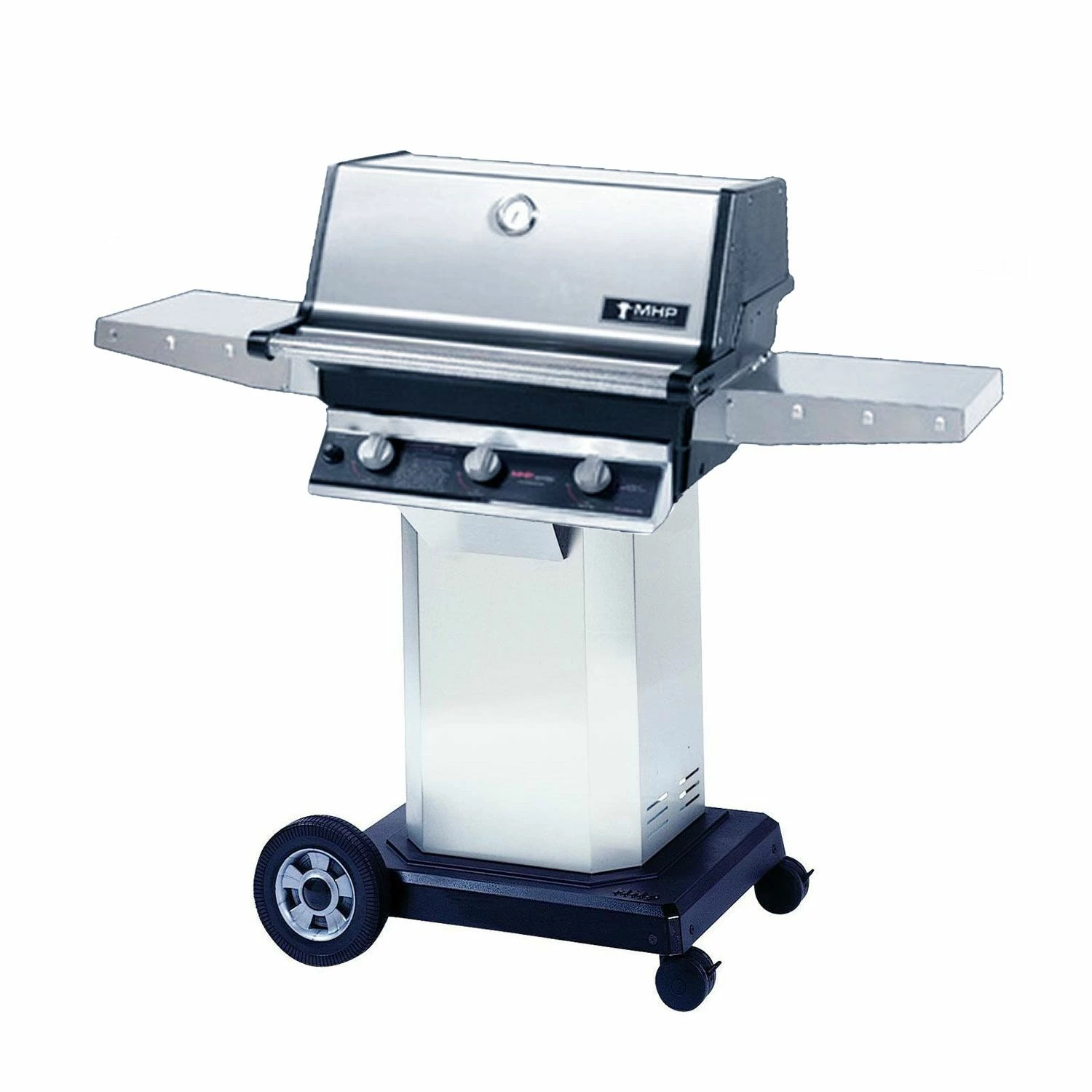 Modern Home Products THRG2 Hybrid Gas Grill with SearMagic Grids On Cart, 27-Inch offers a premium built-in gas grill option that combines hand-crafted, high quality materials with superior function and timeless tradition. The grill features stainless steel construction to provide an elegant, durable hood that promotes heat retention while the rolling Sta-Kool stainless steel hood handle makes opening your grill a breeze. This unit includes aluminum rust-free SearMagic grids and a stainless steel swing-away warming rack. The reversible SearMagic technology is characterized by one wide-ribbed side for achieving professional sear lines and one smooth side for foods such as fish or vegetables. The hybrid burner system consists of 2 cast stainless steel oval burners and 1 ceramic infrared burner that works together with the FlavorMaster porcelain briquettes to create 48,000 BTU of power and adds a high performance searing option for improved grilling flexibility. The on-cart grilling option offers the 27-inch gas grill head on a freestanding aluminum cart with two wheels. You also have the option to pair your grill with a 4-wheeled (2 casters) black aluminum or stainless steel column. All of this, in addition to two added stainless steel side shelves, the 433 square inches of main cooking area and built-in temperature gauge, makes it is easy to see why the THRG2 from MHP is an ideal grilling option for anyone who enjoys different grilling methods. Upgrade your grill with a SearMagic Infrared Zone Side Burner, Stainless Steel Side Burner or Infra-Roast Rear Rotisserie Burner.
