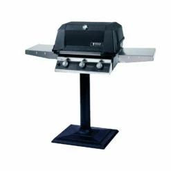 Modern Home Products W3G4DD Tri-Burn Gas Grill with SearMagic Grids On Patio Base, 27-Inch offers a premium built-in gas grill option that combines hand-crafted, high quality materials with superior function and timeless tradition. The grill features cast aluminum construction to provide a durable housing and grill bottom that promotes heat retention and rust resistance while the rolling Sta-Kool stainless steel hood handle makes opening your grill a breeze. This unit includes aluminum rust-free SearMagic grids and a stainless steel swing-away warming rack. The reversible SearMagic technology is characterized by one wide-ribbed side for achieving professional sear lines and one smooth side for foods such as fish or vegetables. The unique Tri-Burn system consists of 3 cast stainless steel burners and flavor plates that work together to create 35,000 BTU of power. The individual temperature controls this option provides gives the griller maximum flexibility when cooking. The on-post grilling option offers a 48-inch in-ground post or a bolt-down post for your grilling needs – these posts are aluminum constructed with stainless steel tubing to ensure a durable, reliable setup. You also have the option to pair your grill with a patio base on either a black aluminum or stainless steel column. All of this, in addition to two added stainless steel side shelves, the 433 square inches of main cooking area and built-in temperature gauge, makes it is easy to see why the W3G4 from MHP is an ideal grilling option for anyone needing complete burner independence. Upgrade your grill with a SearMagic Infrared Zone Side Burner, Stainless Steel Side Burner or Infra-Roast Rear Rotisserie Burner.