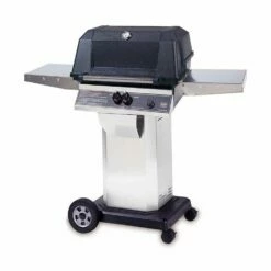 Modern Home Products WNK4 Gas Grill On Cart, 27-Inch offers a premium standing gas grill option that combines hand-crafted, high quality materials with superior function and timeless tradition. The grill features cast aluminum construction to provide a durable housing and grill bottom that promotes heat retention and rust resistance while the rolling Sta-Kool stainless steel hood handle makes opening your grill a breeze. This unit includes 5/16-inch thick stainless steel grids and a secondary warming rack or can be upgraded to include two aluminum rust-free SearMagic grids and a SearMagic warming rack. The reversible SearMagic technology is characterized by one wide-ribbed side for achieving professional sear lines and one smooth side for foods such as fish or vegetables. The H-shaped dual burner along with the FlavorMaster porcelain briquettes work together to create 40,000 BTU of power and provide precise heat control for the perfect BBQ flavor. The on-cart grilling option offers the 27-inch gas grill head on a freestanding aluminum cart with two wheels. You also have the option to pair your grill with a 4-wheeled (2 casters) black aluminum or stainless steel column. All of this, in addition to the 433 square inches of main cooking area, two added stainless steel side shelves and built-in temperature gauge, makes it is easy to see why the versatile WNK4 from MHP is the brand’s most popular grill. Upgrade your grill with a SearMagic Infrared Zone Side Burner, Stainless Steel Side Burner or Infra-Roast Rear Rotisserie Burner.
