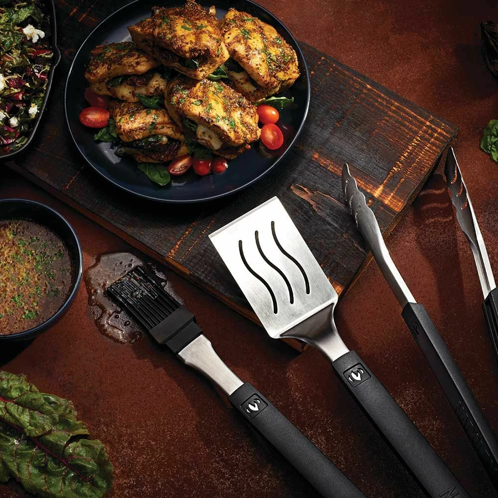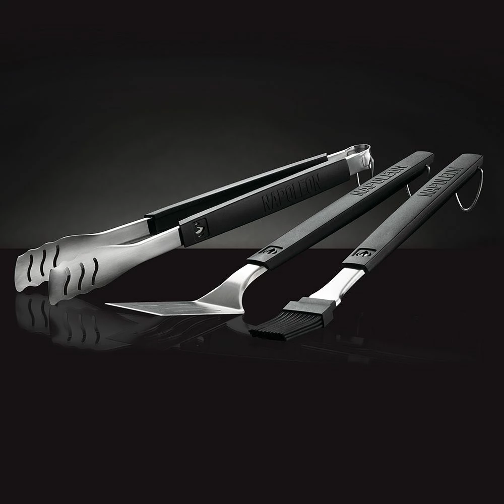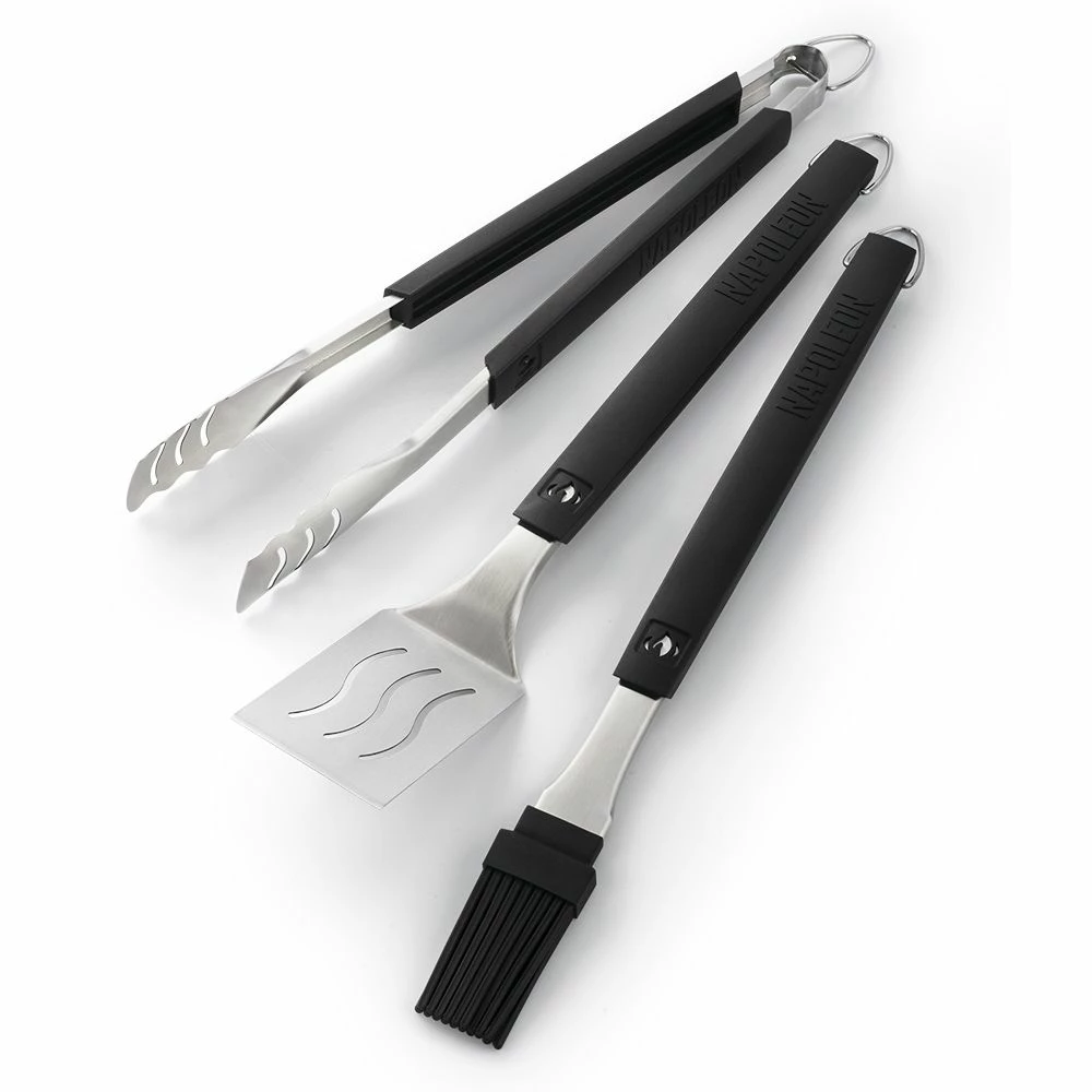 Napoleon 70054 Mass Toolset provides a premium kitchen tool set for use in your outdoor kitchen. This three-piece set includes an extra-long spatula, easy-lock tongs and a silicone basting brush to help you cook your favorite meals. Each of these products features stainless steel construction to ensure durability, and the basting brush features a heat resistant silicone head.