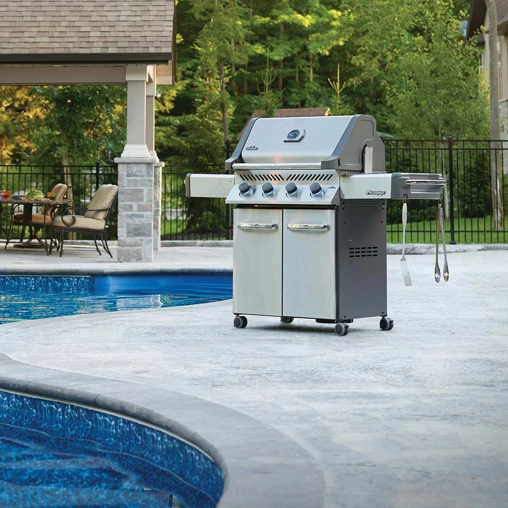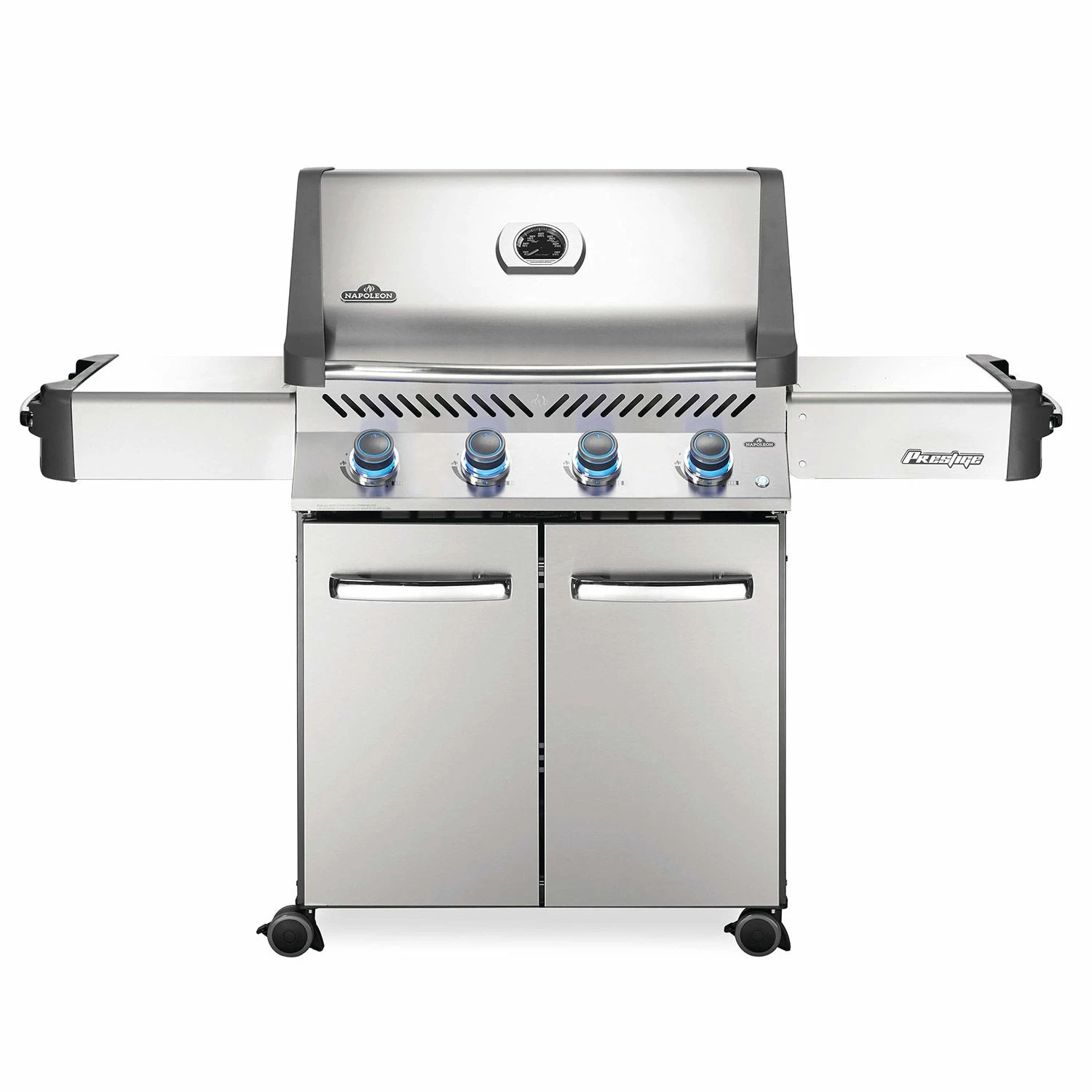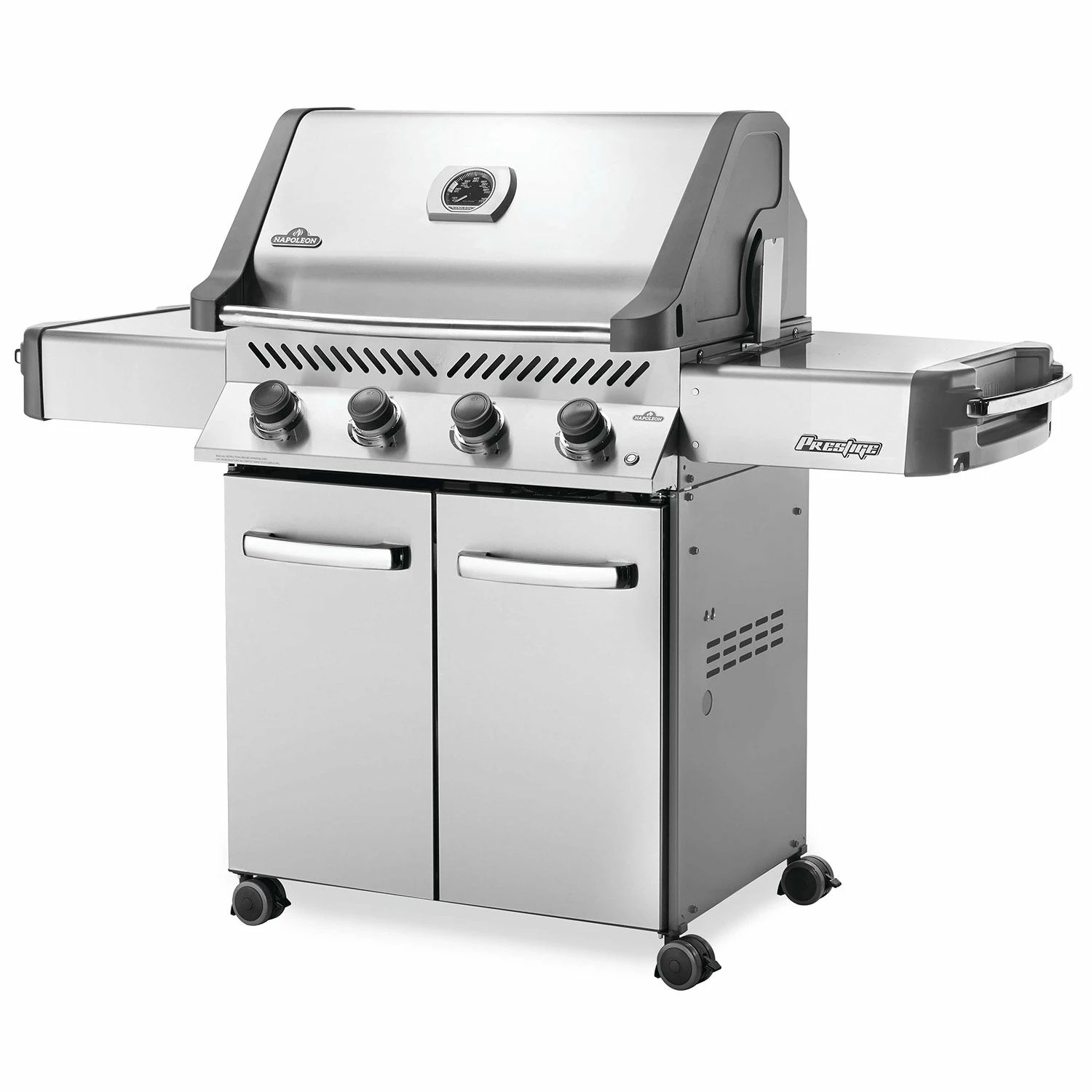 Napoleon P500-3 Prestige 500 Gas Grill On Cart, 28-Inches delivers high end performance without the price tag of a high end grill. The solid 304 stainless steel construction is designed for long term durability and ensures the grill will hold up to the elements. The (4) main grilling burners are rated for a 12,000 BTU maximum and feature a solid 304 stainless steel tube construction while the stainless steel sear plates help protect the burners and provide even heat distribution, preventing hot and cold spots across the 500in² grill surface.