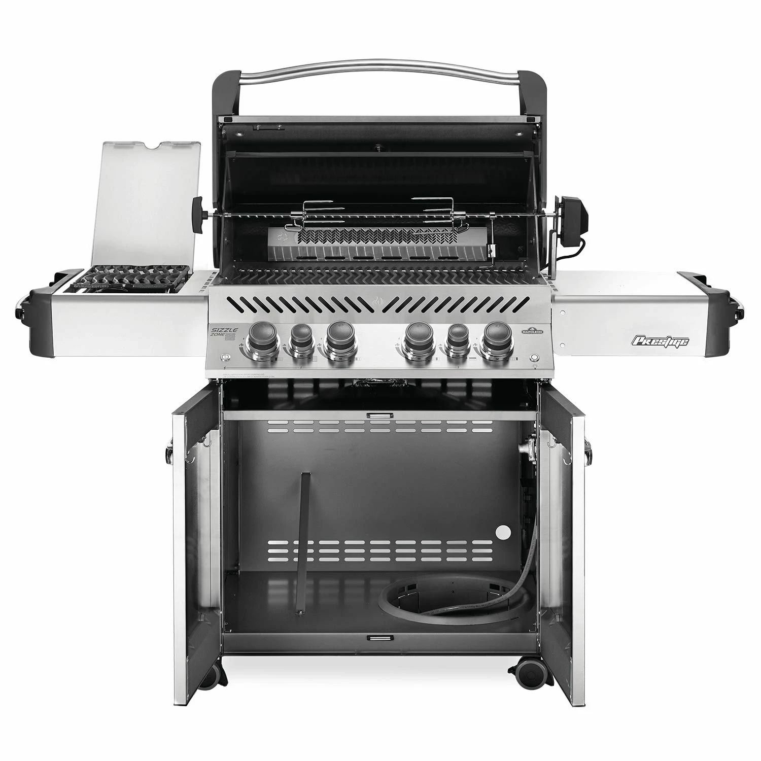Napoleon P500RSIB-3 Prestige 500 Gas Grill On Cart with Rotisserie and Side Burner, 28-Inches delivers top notch performance without the price tag of a high end grill. The solid 304 stainless steel construction is designed for long term durability and ensures the grill will hold up to the elements. Each of the (4) main grilling burners are rated for a 12,000 BTU maximum and feature solid 304 stainless steel tube construction, and the stainless steel sear plates help protect the burners and provide even heat distribution, preventing hot and cold spots across the 500in² grill surface.