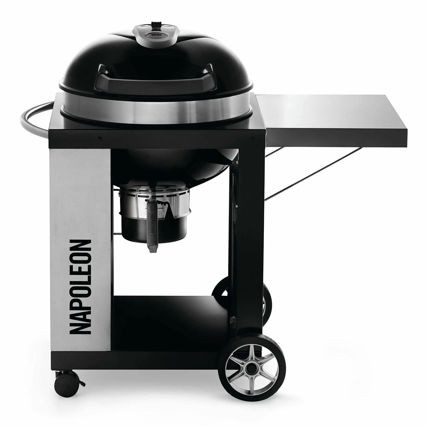 Napoleon PRO22K-CART-2 Rodeo Pro Charcoal Kettle Grill on Cart provides a traditional charcoal grill with tremendous maneuverability; the 22.5″ diameter kettle provides 365 square inches of grilling surface. The heavy gauge black porcelain lid and bowl are durable and the heavy steel ash catcher makes ash removal a breeze while the stainless steel charcoal grate and cast iron hinged cooking grids allow fast and easy direct and indirect cooking. The unique cart features a fold down stainless steel side shelf with two heavy duty wheels and two casters for easy mobility whether you’re on your patio or taking your grill on the go.