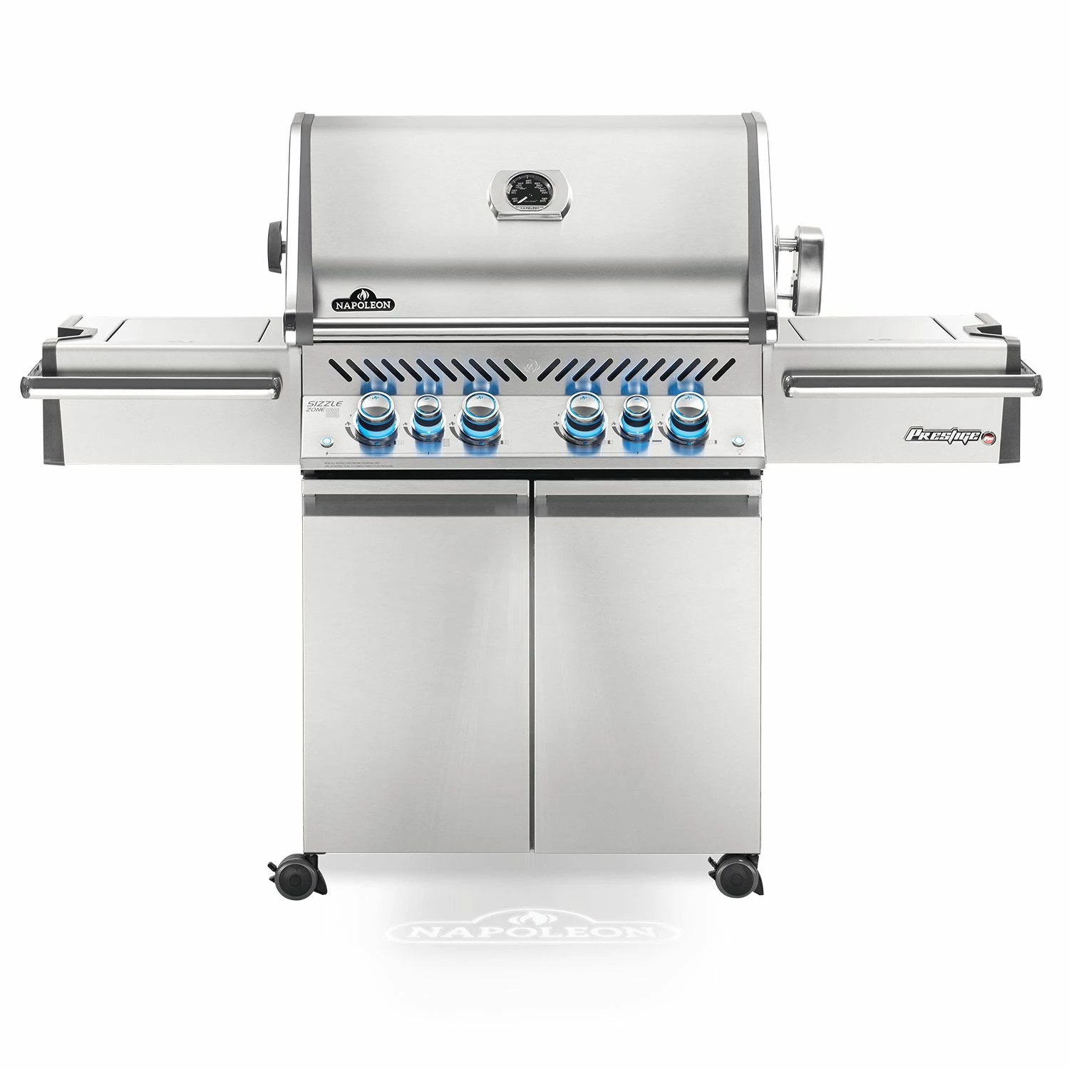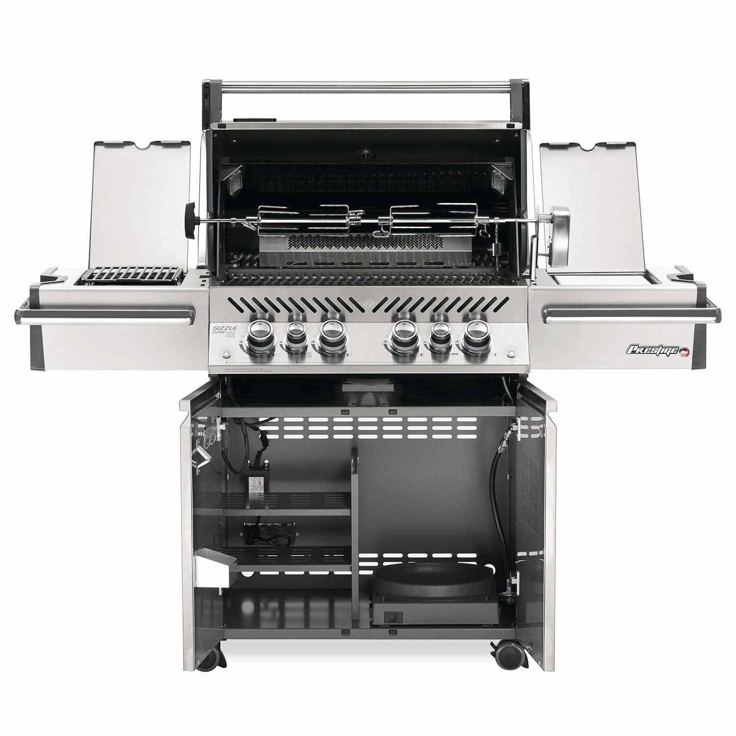 Napoleon PRO500RSIBSS-3 Prestige PRO 500 Gas Grill On Cart with Rotisserie and Side Burner, 28-Inches delivers high end performance without the price tag of a high end grill. The solid 304 stainless steel construction is designed for long term durability and ensures the grill will hold up to the elements. The (4) main grilling burners are rated for a 12,000 BTU maximum and feature a solid 304 stainless steel tube construction while the stainless steel sear plates help protect the burners and provide even heat distribution, preventing hot and cold spots across the 500in² grill surface.