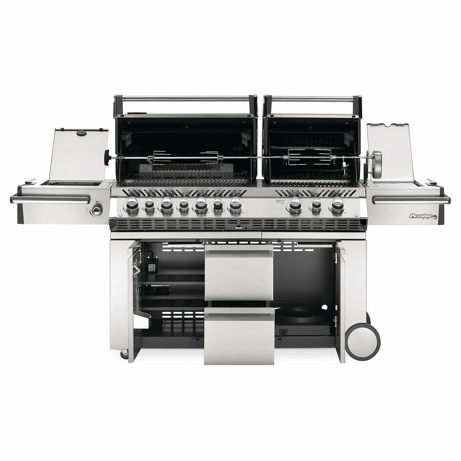 Napoleon PRO825RSBISS-3 Prestige PRO 825 Series Gas Grill On Cart with Rotisserie and Side Burner, 45-Inches delivers high end performance without the price tag of a high end grill. The solid 304 stainless steel construction is designed for long term durability and ensures the grill will hold up to the elements. The (4) main grilling burners are rated for a 12,000 BTU maximum and feature a solid 304 stainless steel tube construction while the stainless steel sear plates help protect the burners and provide even heat distribution, preventing hot and cold spots across the 500in² main grill surface while the secondary grill hood features (2) 14,000 BTU ceramic infrared burners that can reach up to 1,800 F to achieve steakhouse quality searing; also included is an independent 8,000 BTU warming burner for added versatility.