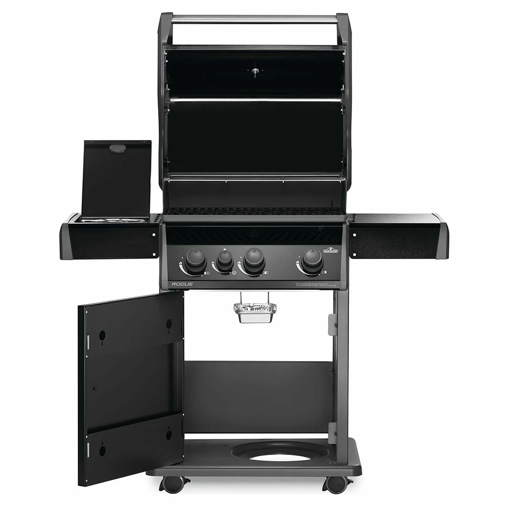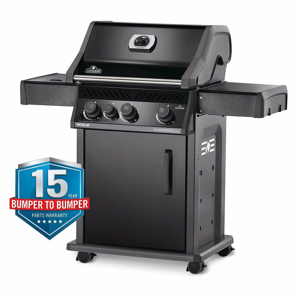 Napoleon R425SBK-1-OB Rogue 425 Gas Grill On Cart with Side Range Burner offers a premium grill at an affordable price. Featuring durable construction, this offers superior rust resistance and is backed by the reliability of the Napoleon Grills name. Three main stainless steel burners and one range side burner combine to provide an impressive grilling experience, while porcelainized cast iron WAVE cooking grids feature Napoleon’s iconic design. Folding side shelves create a space-saving design, while the JETFIRE ignition system offers convenience and reliability every time you grill. Finally, this grill features an ACCU-PROBE temperature gauge in the hood to round out its premium design. This grill is available in propane and natural gas configurations to meet your needs.