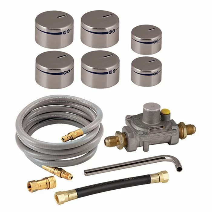- Includes – Appliance-style natural gas regulator, 10-foot natural gas hose, die cast knobs and orifice tool