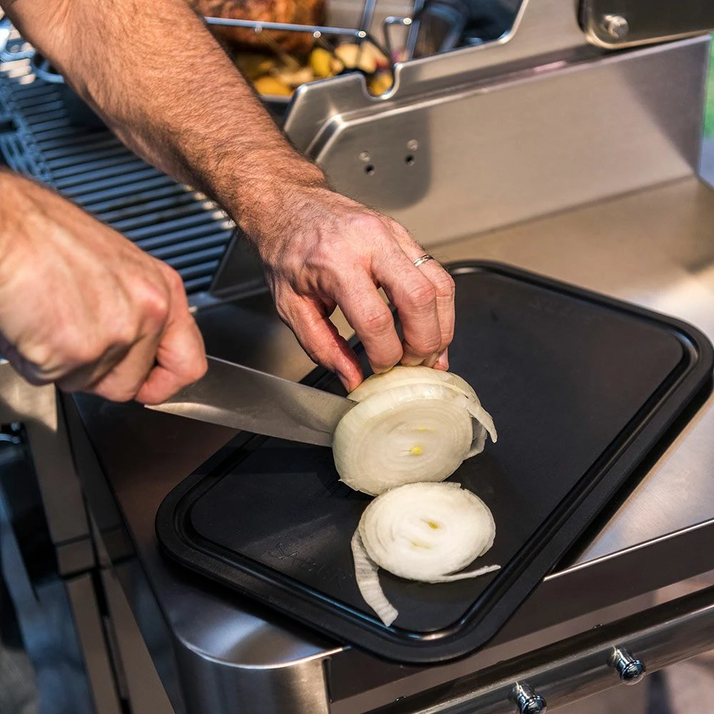 Saber A00AA7018 Stainless Steel Roasting Pan with Cutting Board provides a premium accessory for use with your grill. This roasting pan and cutting board expand your grilling options by allowing roasting directly on your grill surface. Featuring 304 stainless steel construction, this pan has been built to last. A high-density polyethylene cutting board offers added functionality and features a groove to collect meat juices for use in sauce and gravy. Heavy-duty riveted handles allow for easy lifting, while a dishwasher-safe design provides added convenience.