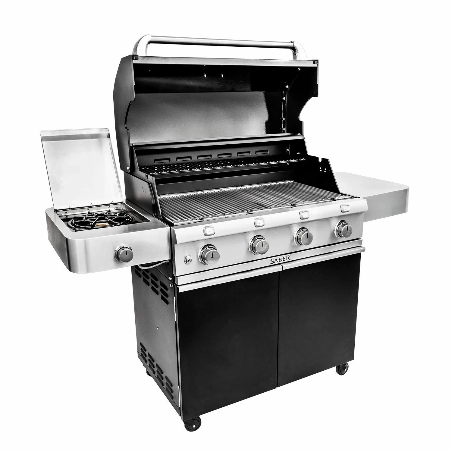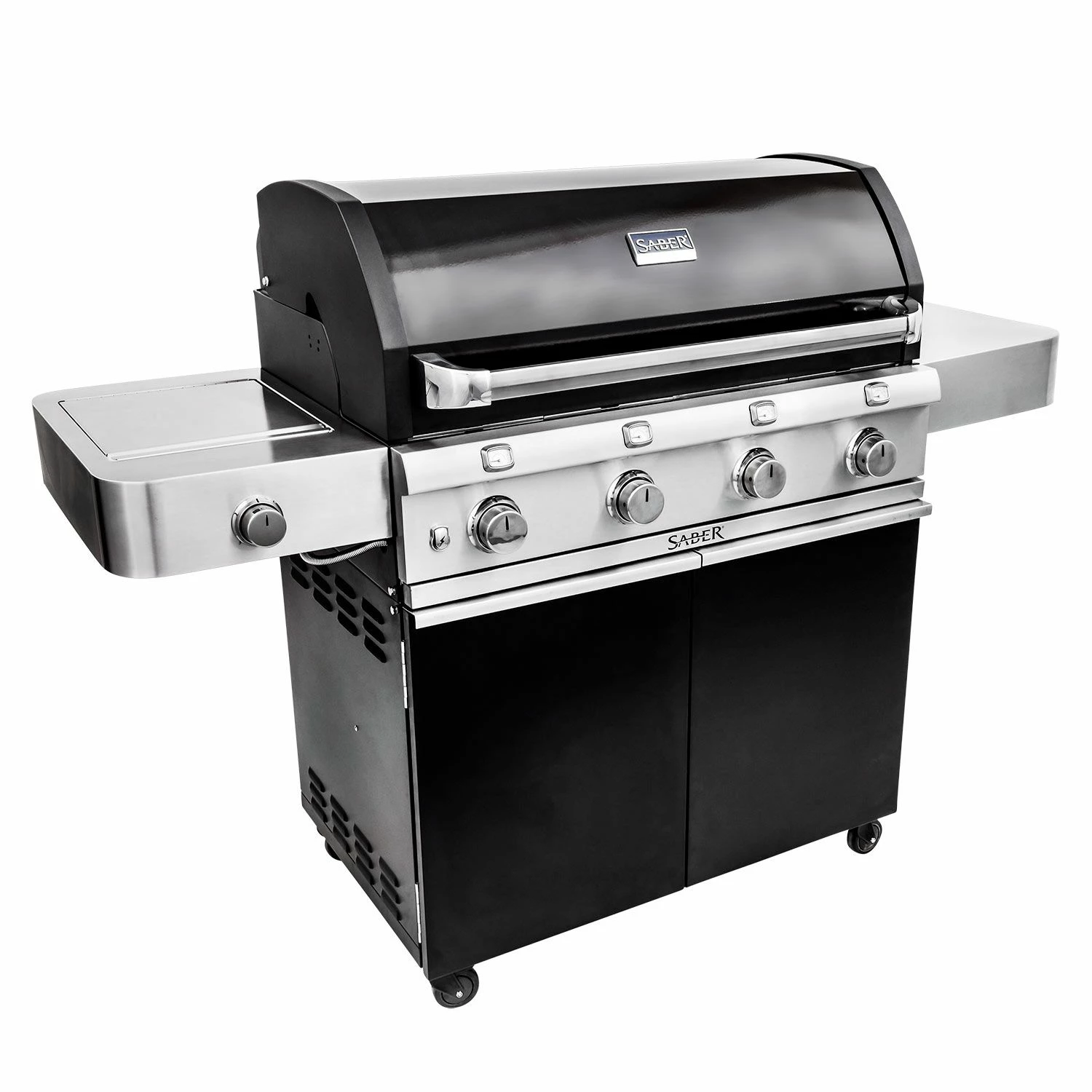 Saber R67CC1117 4-Burner Deluxe Freestanding Infrared Grill with Side Burner, Black, 40-Inches provides a premium addition to your outdoor kitchen. This grill brings restaurant quality results to your home with its patented Saber Cooking System. This innovative burner design heats evenly, eliminates flare-ups, and uses up to 30 percent less gas than comparable burners. This grill also offers a wider temperature range than traditional grills–from high temperature searing to low and slow roasting and everything in between. The Saber infrared can also pre-heat to searing temperatures in only 12 minutes to reduce the time it takes to get your food from grill to plate. When you’re finished grilling, the easy-to-clean design of the Saber grill allows food drippings to be burned off and brushed away with ease to save you even more time.