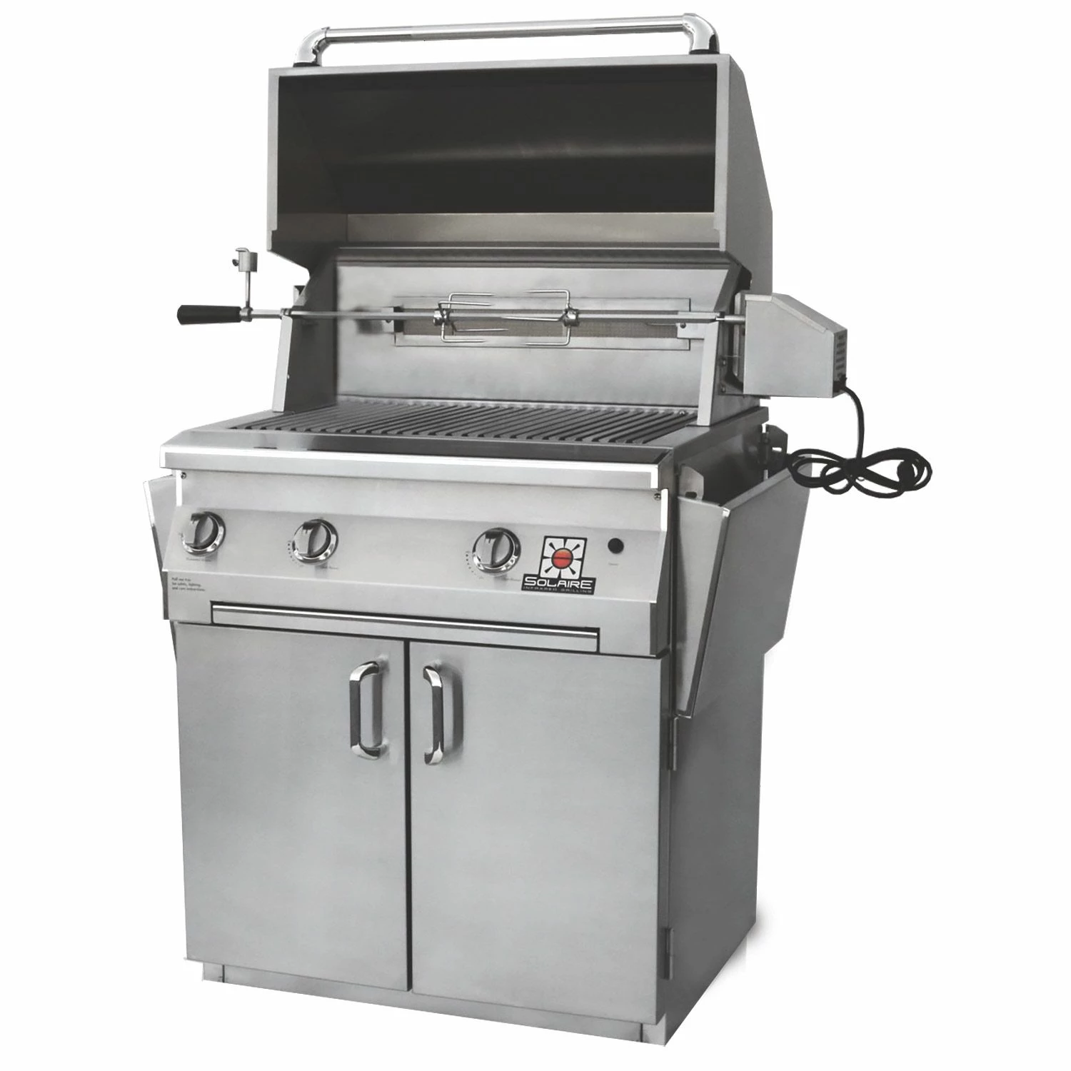 Solaire AGBQ-30 30-Inch Deluxe Freestanding Grill on 2-Door Cart with Rotisserie provides a professional quality infrared grill designed to offer an improved backyard grilling experience. Featuring two main infrared burners capable of up to 55,000 BTU, this grill offers impressive heating ability across 455 square inches of main grilling area and a total grilling area of 703 square inches. Select from all infrared, all convection, and InfraVection burner configurations to match your grilling needs. The Solaire 30-inch Deluxe model also includes a 14,000 BTU rear infrared rotisserie burner with a motor, spit rod, forks, and a counterweight to expand the cooking options available on this grill. The Solaire 30-inch Deluxe model also includes a 14,000 BTU rear infrared rotisserie burner with a motor, spit rod, forks, and a counterweight to expand the cooking options available on this grill. Your grilling experience can be further enhanced with Solaire’s large assortment of grilling accessories engineered to help you grill to your full potential (sold separately). As an added bonus, this grill features a limited lifetime warranty on all stainless steel construction, main burners, and V-grilling grids as well as a two-year warranty on its ignition system and a one-year warranty on nearly all other parts.