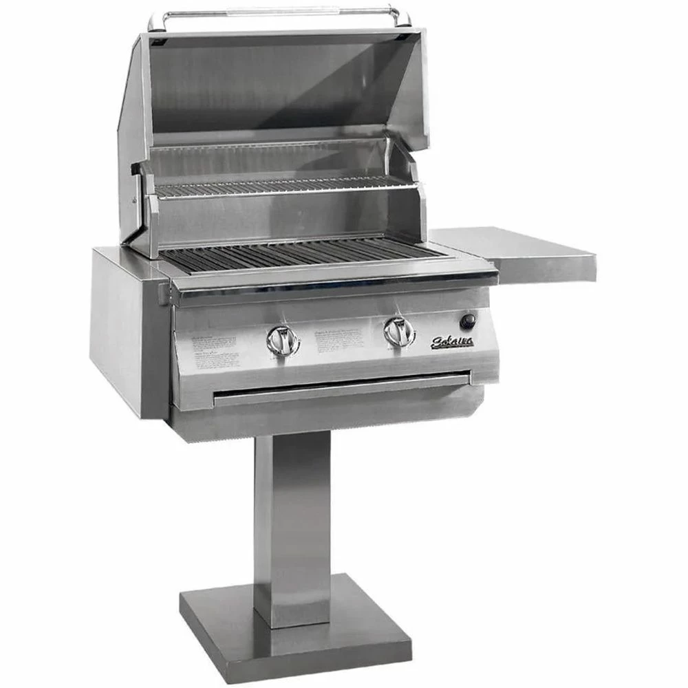 All Solaire grills offer an impressive collection of standard features to stand out from the competition. These grills offer infrared burners with ceramic plates and stainless steel construction for commercial quality cooking potential, while stainless steel V-grilling grates enhance flavor and reduce flare-ups. These impressive appliances offer 304 stainless steel construction with welded seams and no mechanical fasteners to ensure long-term durability, while hand-polished, mirror-finished accents and metal knobs offer an impressive appearance in any setting. A double skin hood with a stay-cool, stainless steel knurled handle offers added safety, while a removable stainless steel warming rack and drip tray offer added versatility and convenience. This grill features a post mount design to allow for easy installation in almost any space.