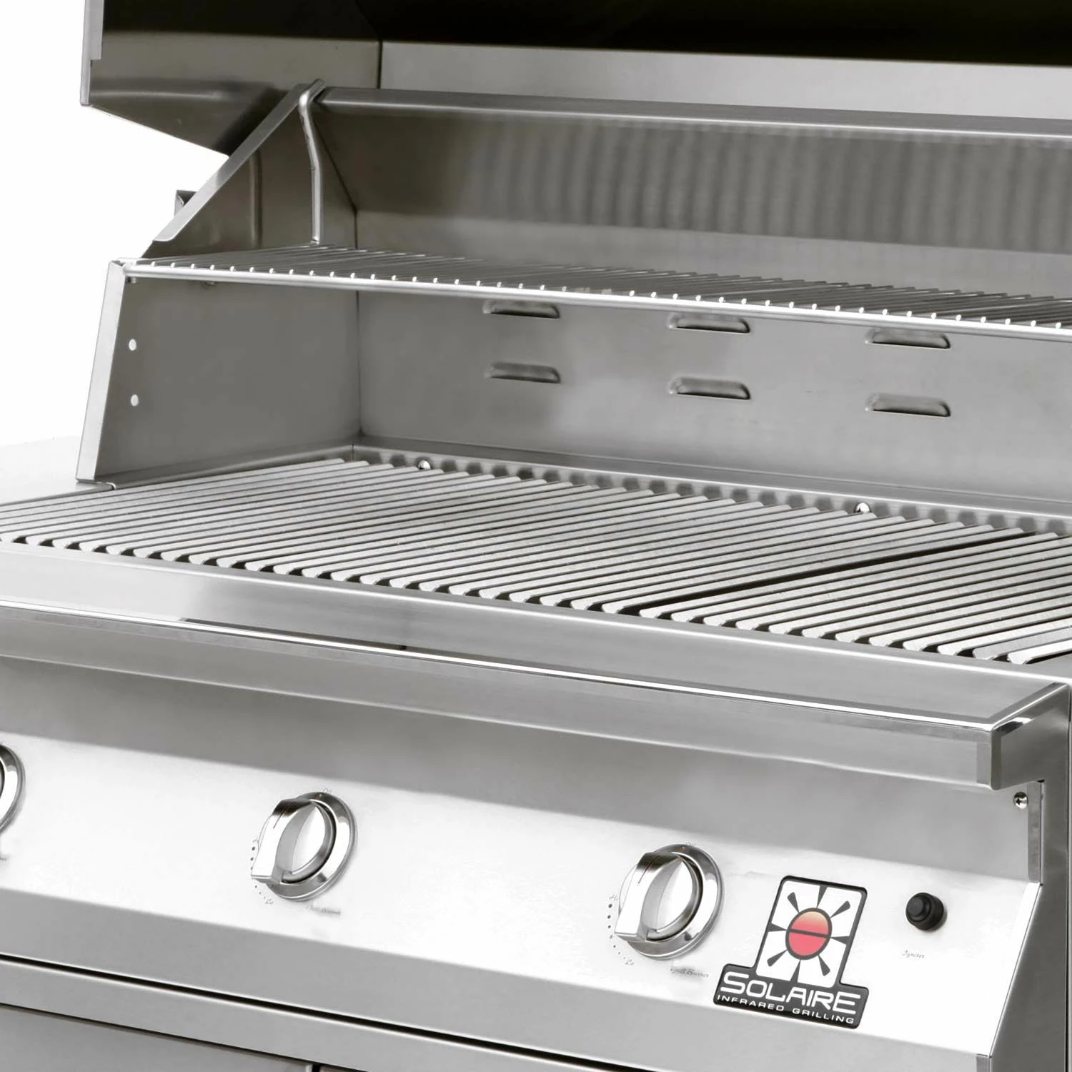 All Solaire grills offer an impressive collection of standard features to stand out from the competition. These grills offer infrared burners with ceramic plates and stainless steel construction for commercial quality cooking potential, while stainless steel V-grilling grates enhance flavor and reduce flare-ups. These impressive appliances offer 304 stainless steel construction with welded seams and no mechanical fasteners to ensure long-term durability, while hand-polished, mirror-finished accents and metal knobs offer an impressive appearance in any setting. A double skin hood with a stay-cool, stainless steel knurled handle offers added safety, while a removable stainless steel warming rack and drip tray offer added versatility and convenience. With their top-supported, self-trimming design, these grills offer easy built-in installation. This grill head can also be removed from its freestanding grill base and built into a grill island if your needs change.