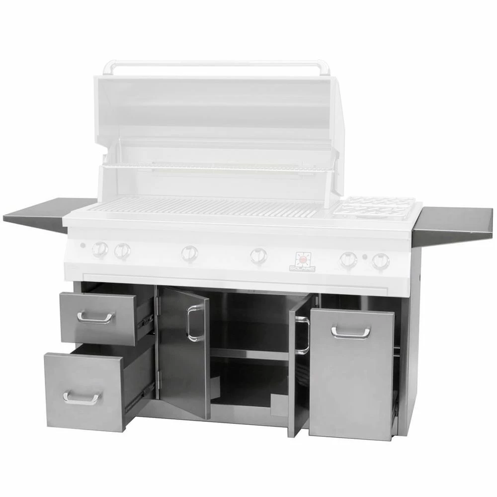 Solaire SOL-IR-56CXA 2-Door/3-Drawer Premium 56-Inch Grill Cart offers a purpose-built base for your Solaire grill, built from high-quality and durable 304 stainless steel for lasting utility. The cart features smart hidden casters to make it easy to move and fold-down shelves for convenient space to prep while you work.